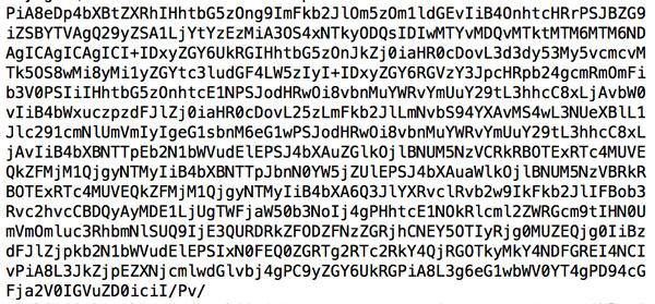 As shown above, the image is directly embedded into the article as text, using an encoding approach called Base64, which is a descendant of sorts to Uuencode. The file is effectively a long block of text that’s too long to share in its raw form, but one section of it looks like this: