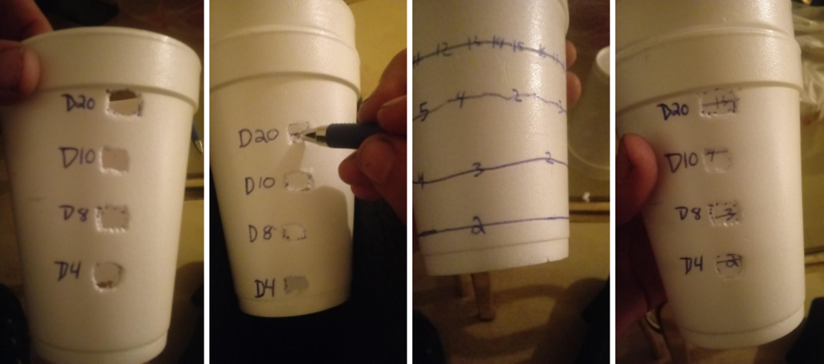 Formerly incarcerated in a US Army jail in Korea, Thommy “Uewneeq” Irvine describes how he created a unique spinner out of styrofoam cups: “We used two styrofoam cups (in a military jail). The inner, at the bottom we wrote 1-4, slightly higher we did 1-6, higher yet 1-8, then further up 1-10, then at the top 1-20. On the second cup we carved out little windows large enough to show the number below. The DM would spin the inner cup under the table until the player told him to stop, he’d then line up the next number on the appropriate dice slot.”