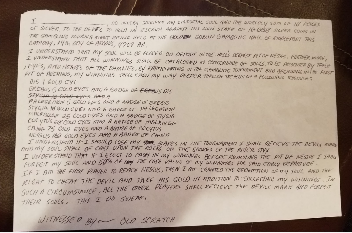 According to Micah, character sheets were gold and players had to hand-make all their own handouts, such as this in-game contract a fellow player named “Hate” made for a Pathfinder game. “Poor bastard made like 10 copies,” Micah says.