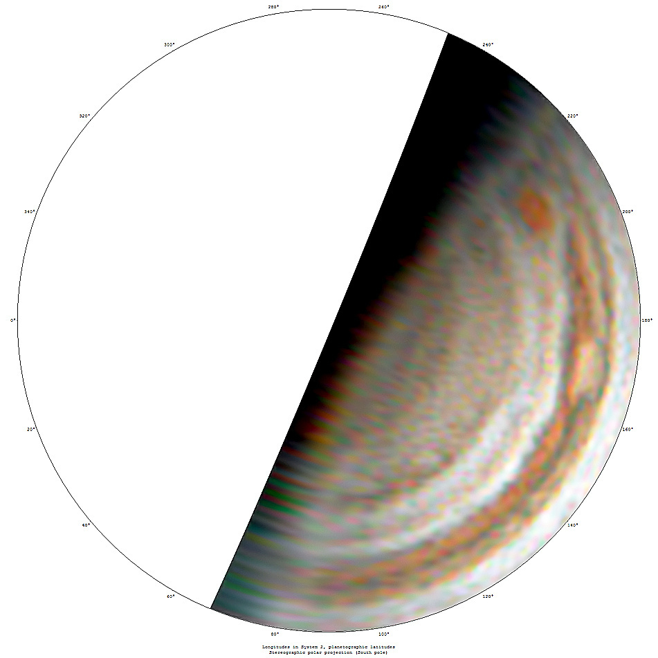 As Rosén received photos from team members, he re-edited them so that they were homogenous. He then sent his edits to colleague Martin Högberg, who used a program called WinJupos to stitch the photos into cylindrical and polar projections of Jupiter’s surface. But as Rosén pieced together the team’s projections, he realized essential pieces of information—specifically the map’s edges—were missing, and that the ends of his map couldn’t be connected. To tackle this problem, he stretched the material he had, using every pixel at his disposal to fill in the gap. Thus, by end of December, the first man-made “map” of Jupiter’s surface was realized.