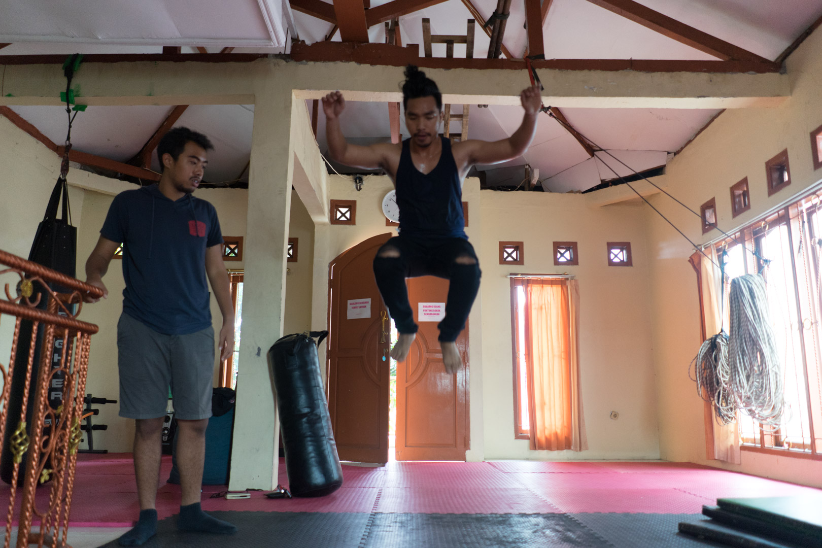 I called up the only guy I could think of who knew how all of this works. Udeh Nans is the founder of the Pejuang Stunt Indonesia school and a regular stuntman in Indonesia’s action movie scene. He’s one of the guys behind the bone-crushing stunts of The Raid. Can he teach me how to do what my four-year-old self failed to figure out? Or am I only one wrong leap from another trip to the emergency room?