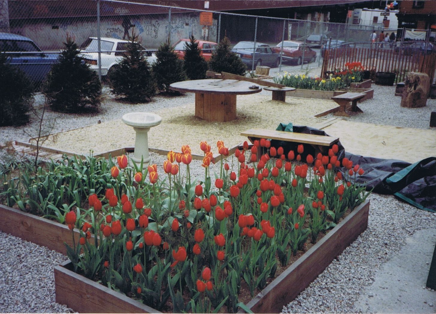 So we said, well, that’s too bad, and cleared out all the trash ourselves and built beds. I don’t know where the money came from, I don’t know where the lumber came from, but we built these beds and we planted tulips. [A Post article from the time claims the money was raised through a neighborhood party.] None of us knew anything about gardening. We planted a bunch of tulip bulbs and daffodil bulbs and I remember planting them and not knowing which end went down. Like I wasn’t even sure we had the right end down and up, because we knew so little.