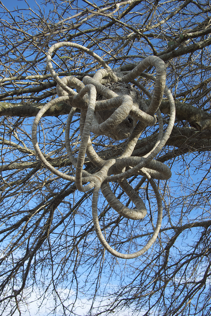 Elgin Rivers, circuit, 2014. Wood, lasso, acrylic paint, sand, moonstones, and labradorite, 23 x 19 x 13 inches.