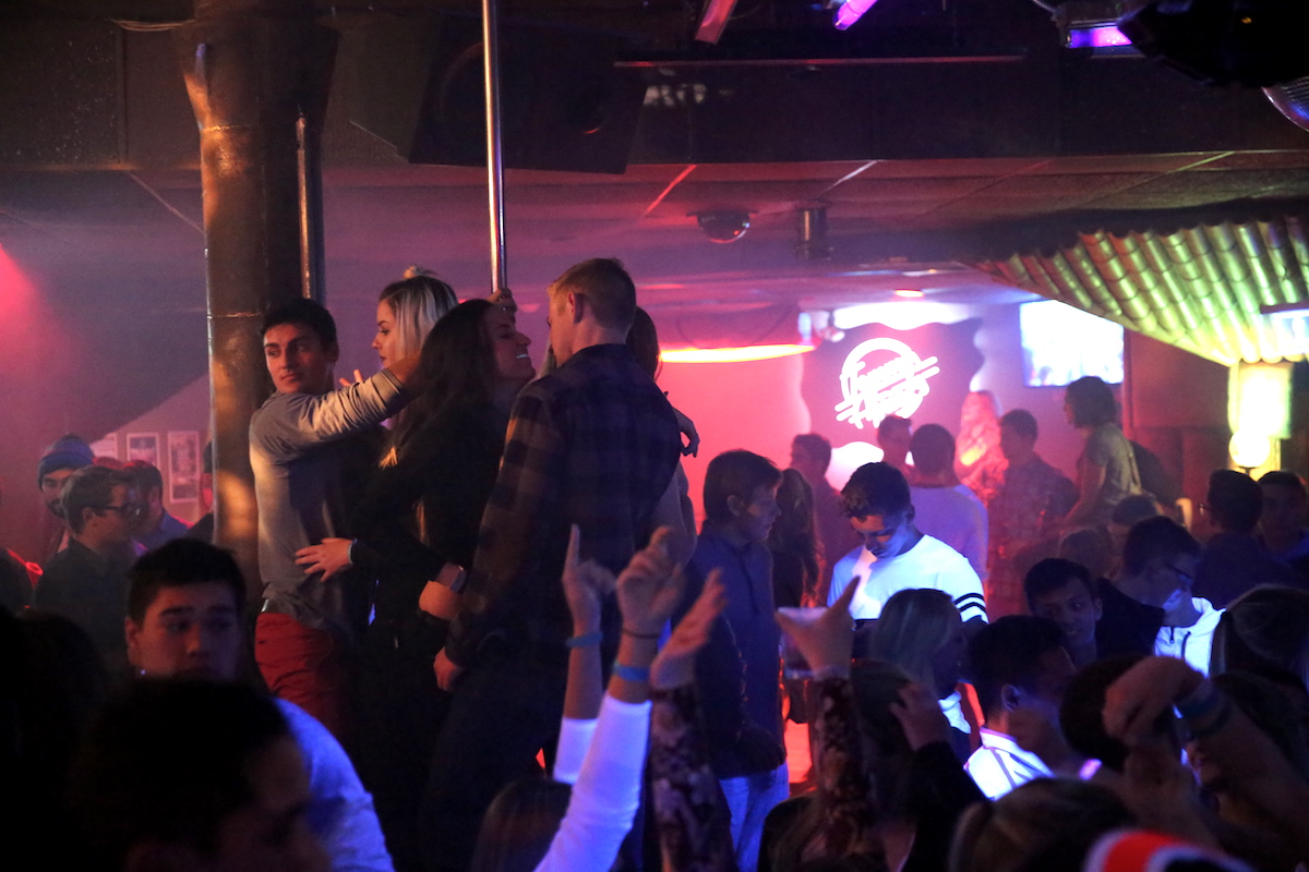 I ended up at another club called Tommy Africa’s in Whistler on Saturday night of MLK around 8 PM where go-go dancers wearing American-themed outfits were performing onstage. It was the last stop of an official club crawl where I spoke to a number of Americans who were already well in the bag about how they ended up in Canada for the weekend. As part of the crawl, attendees, including myself, were given nametags with coloured stickers that denoted the following: green= single, red= taken, yellow= hard to get, blue= horny. While wearing my nametag containing both blue and green stickers, I met some pleasant frat bros.