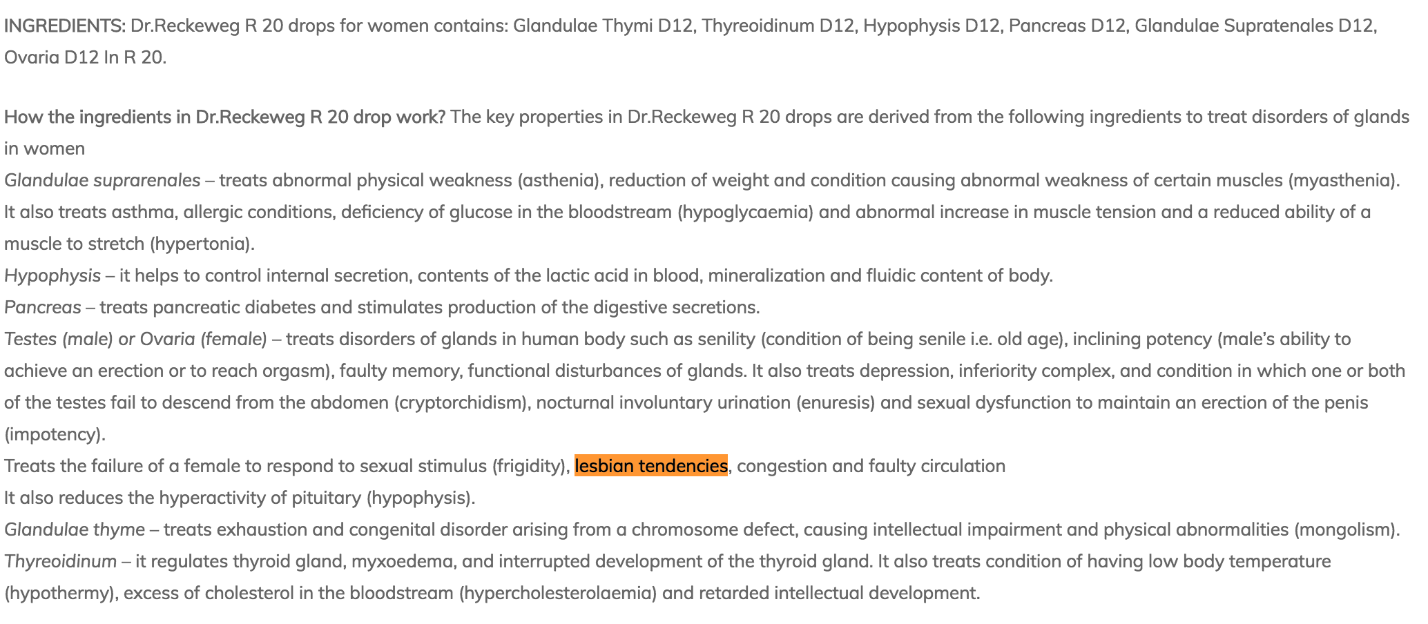But then, a few weeks ago, I read about a homeopathic solution – Dr.Reckeweg R20 Glandular Drops for Women. It’s not new, but a pharmacy website authorised by the Italian Ministry of Health was recently criticised for selling it. That’s because this “homeopathic remedy to support, stimulate, and regulate the female endocrinal glands” claims to include Ovaria among its components, which is supposed to “treat the failure of a female to respond to sexual stimulus (frigidity), lesbian tendencies, congestion and faulty circulation”. Following the public criticism and a mass appeal to Italian health minister Beatrice Lorenzin, many websites selling the product removed the reference to “lesbian tendencies”. But it can still be seen on some cached pages, and other sites still have the mention up, like this Indian web shop for homeopathic remedies.