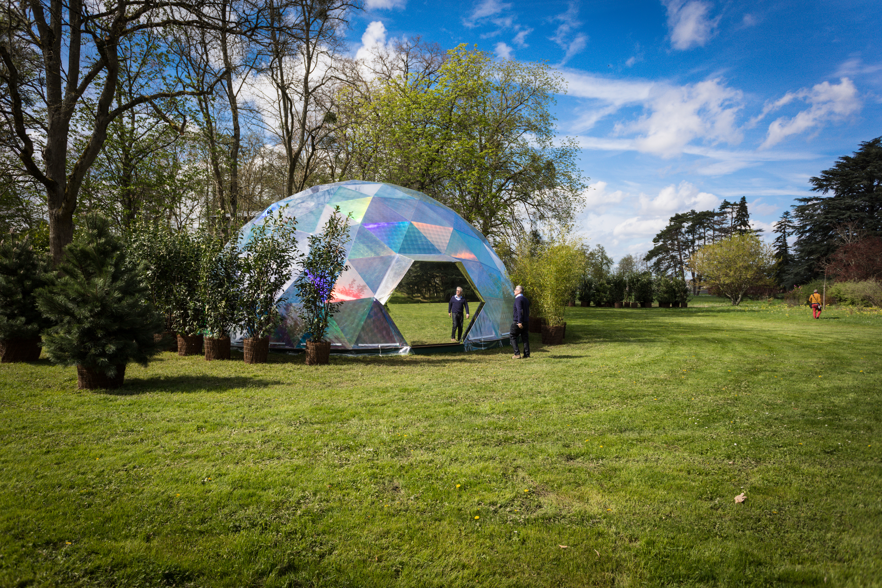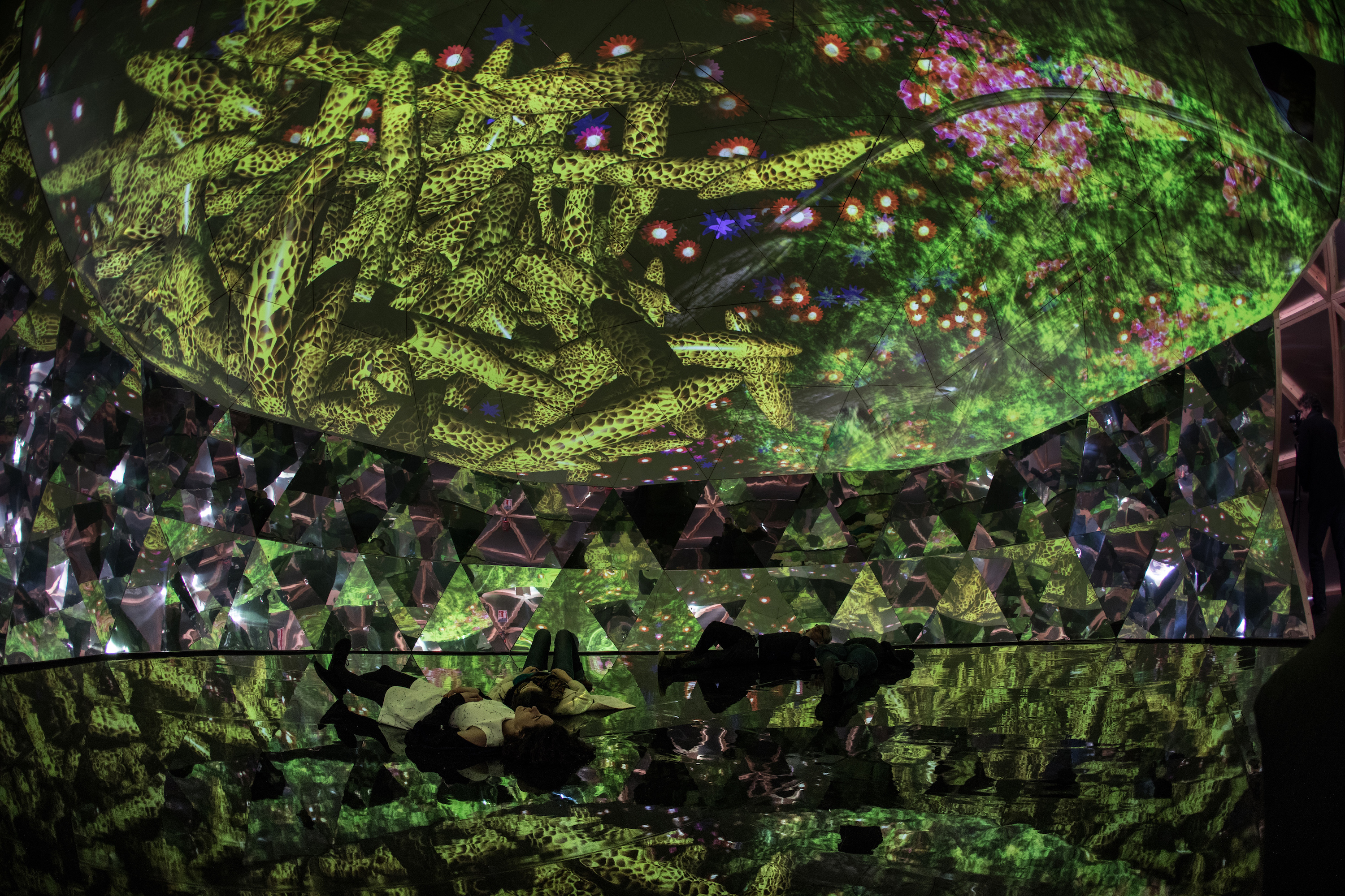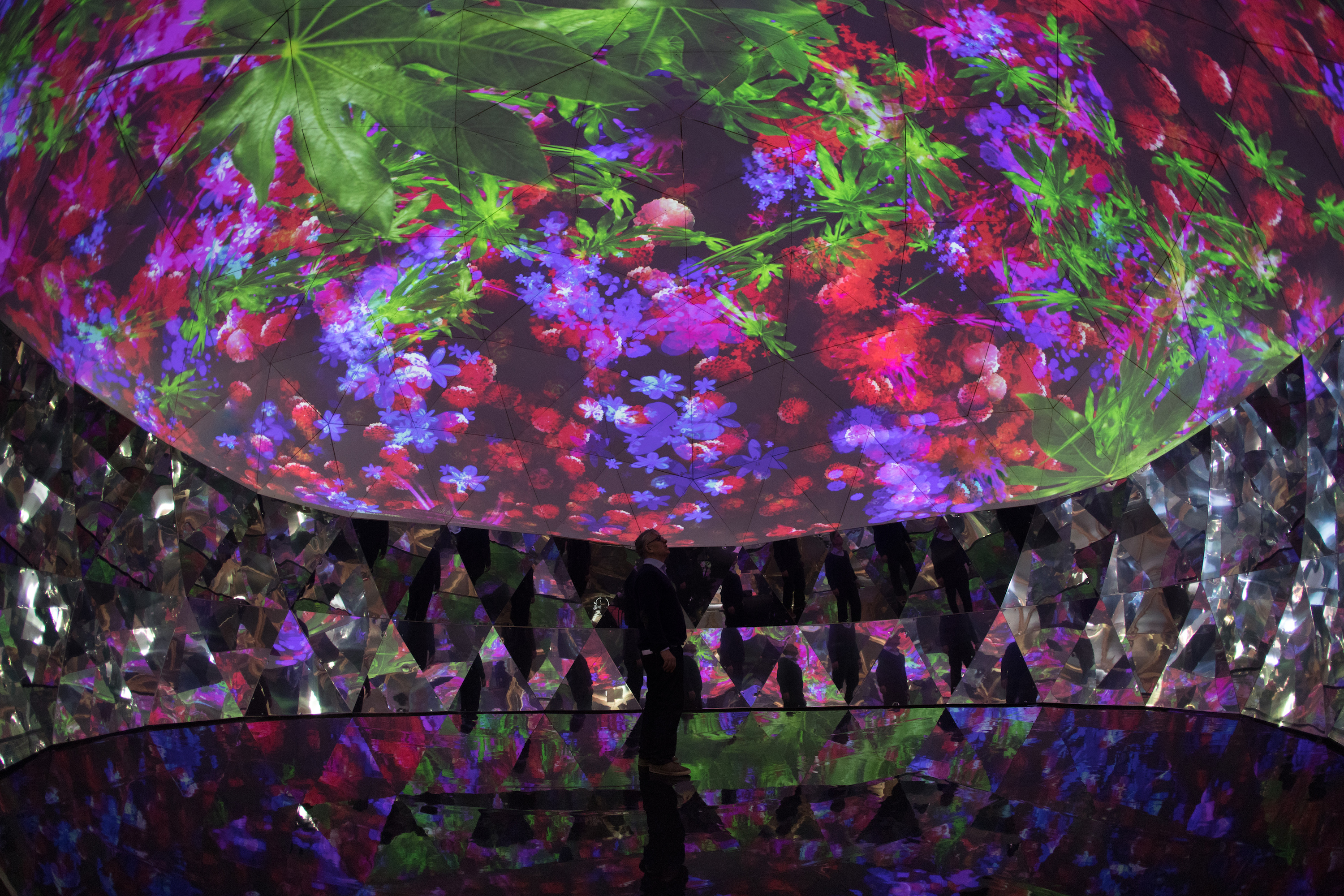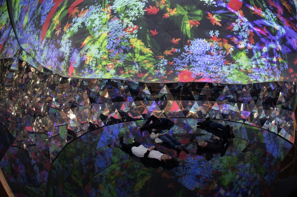 The French artist is known for interactive projection-mapped carpets and revitalizing old architecture with new media art. For his latest project, he had a team construct a 39-foot-diameter geodesic dome from scratch in the gardens surrounding a 1,000-year-old castle called the the Domaine de Chaumont-sur-Loire. Coated with holographic film on the outside, the futuristic “half-elliptical architecture” has an inner shell displaying a 360° video collage of colorful plant life. A sweeping soundtrack by Jacopo Baboni Schilingi immerses visitors in the space, while mirrors at the dome’s base reflects the visuals onto anyone who can break their gaze from the ceiling.