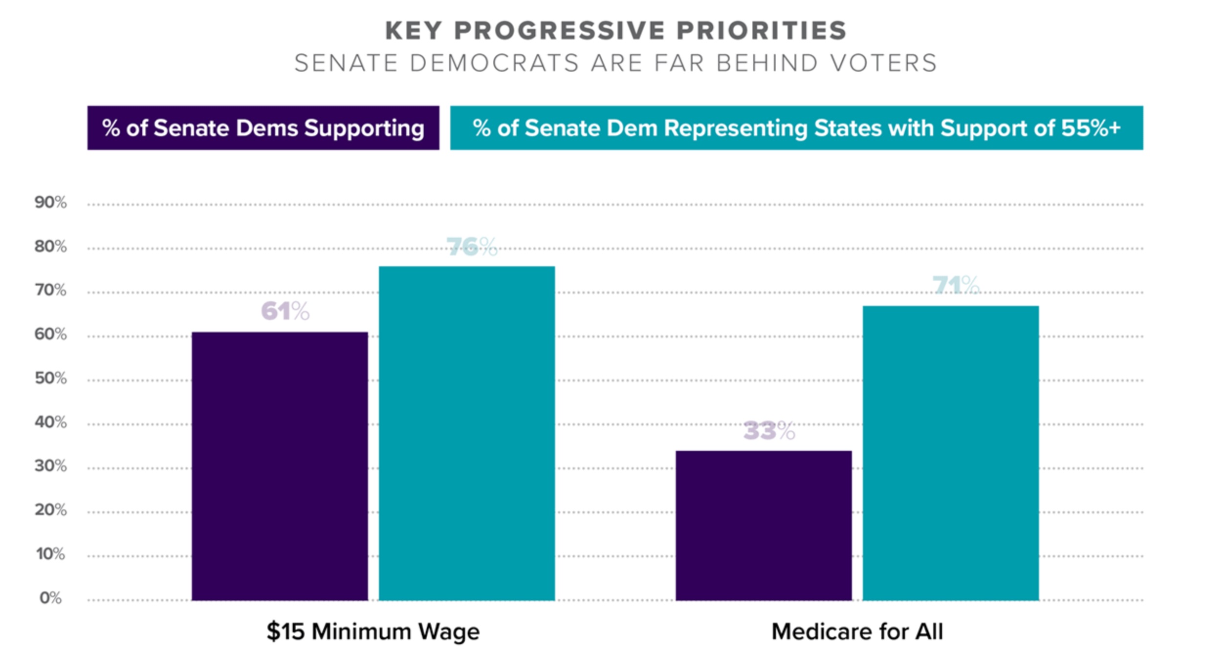 For both the minimum wage and Medicare for all, we were able to compare our estimates to actual Senate legislation. The chart below shows that both policies have support in a wide range of states. Seventy-six percent of Democratic senators represent states where modeled support for a $15 minimum wage is greater than 55 percent. But only 61 percent of those senators support a $15 minimum wage. Sixty-seven percent of Democrats in the Senate represent states where modeled support for Medicare for all is greater than 55 percent, but only 33 percent of Senate Democrats support Medicare for all. Despite the fact that 86 percent of Democratic senators represent states with 55 percent support for repealing the Hyde Amendment, we couldn’t find any Senate legislation that has been introduced to repeal Hyde. And despite the fact that every Democratic senator represents a state where support for regulating CO2 is 55 percent or greater, only five senators currently support transitioning to 100 percent renewable energy by 2050. Finally, though every Democratic senator represents a state where support for ending mandatory minimums for nonviolent crimes is 55 percent or greater, the only legislation on the issue is a bipartisan bill that only slightly curbs mandatory minimums.