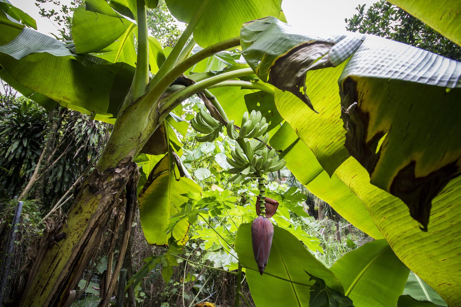 Banana trees aren’t actually trees—they are more like tightly-wrapped stalks. They produce fruit only once in their lifetime, when a pod-like, magenta-colored flower descends from the tree and bananas sprout around it. The whole thing looks vaguely alien. After that first crop of bananas, the tree is cut down and new trees emerge from its base.