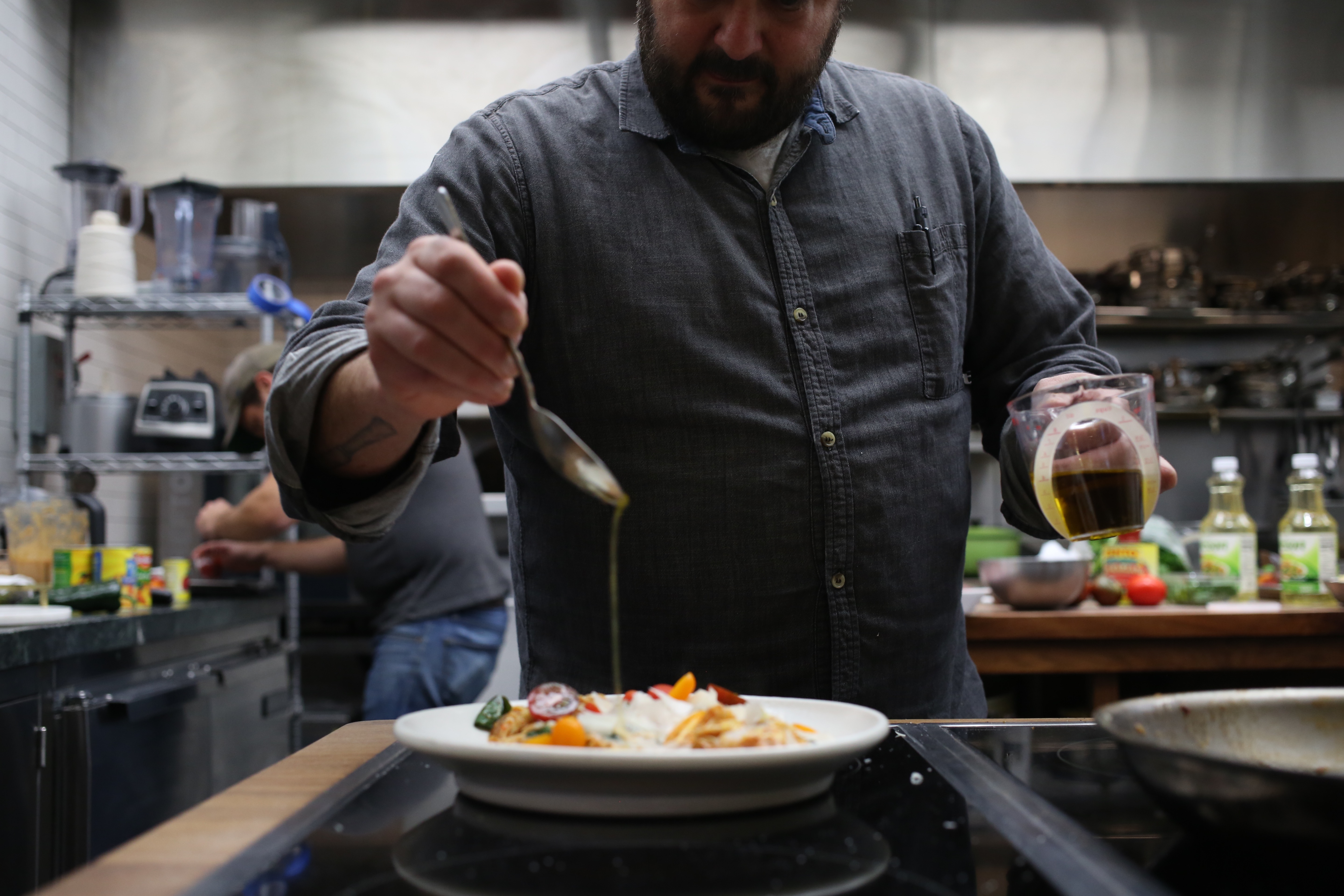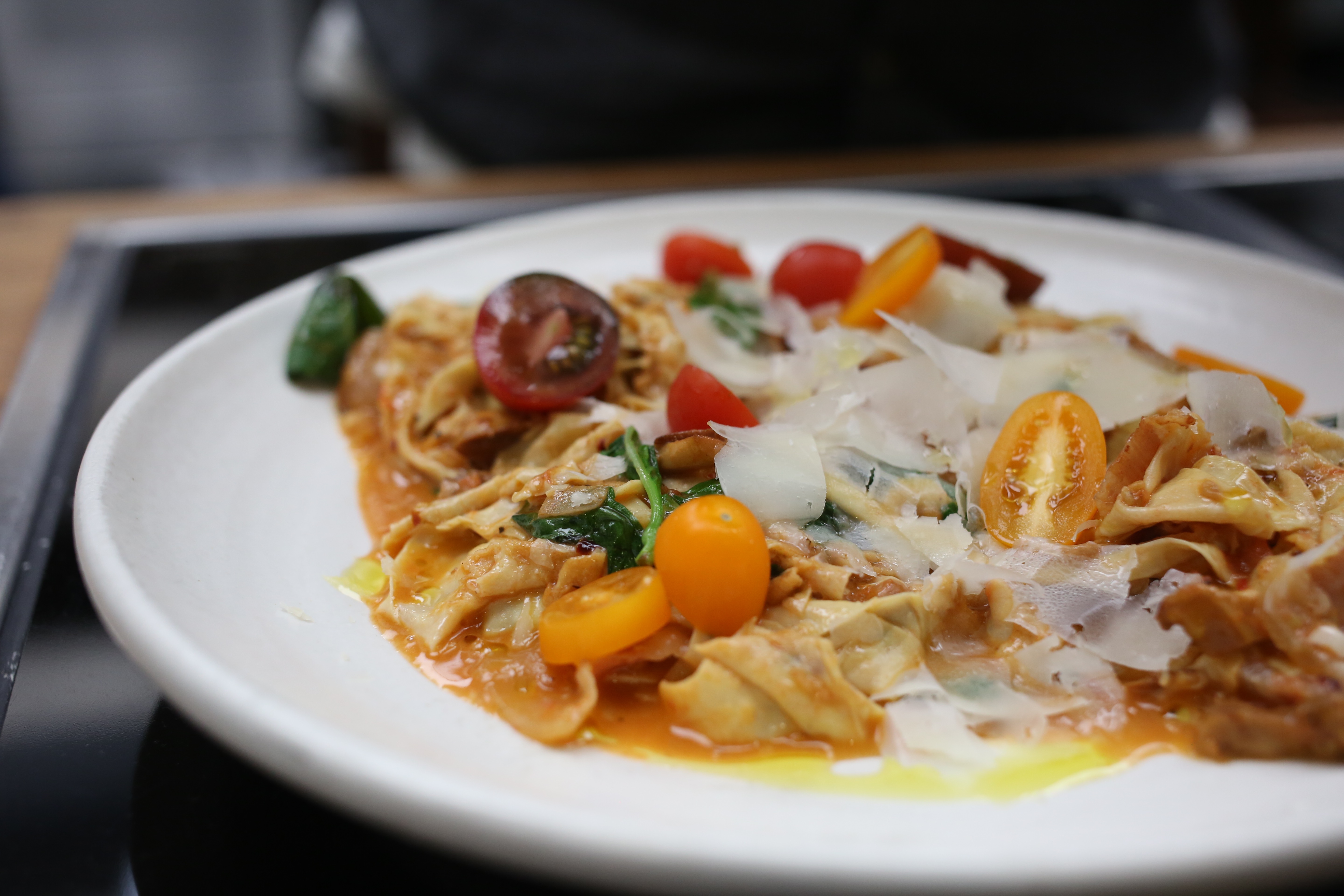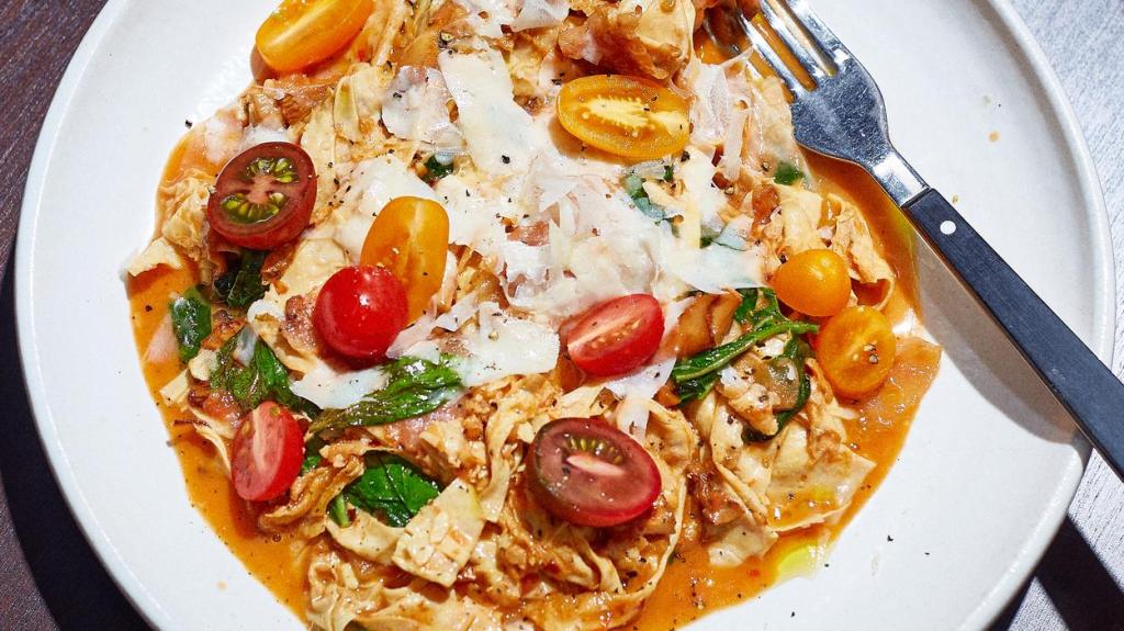 “My non-existent Roman grandmother would roll over in her grave,” Brioza says, drily. He unfolds each sheet of tofu skin—which is the thin film that develops on the top of soy milk that is being boiled to turn into tofu—then slices them into wide noodle-like strands, like a soy papardelle.