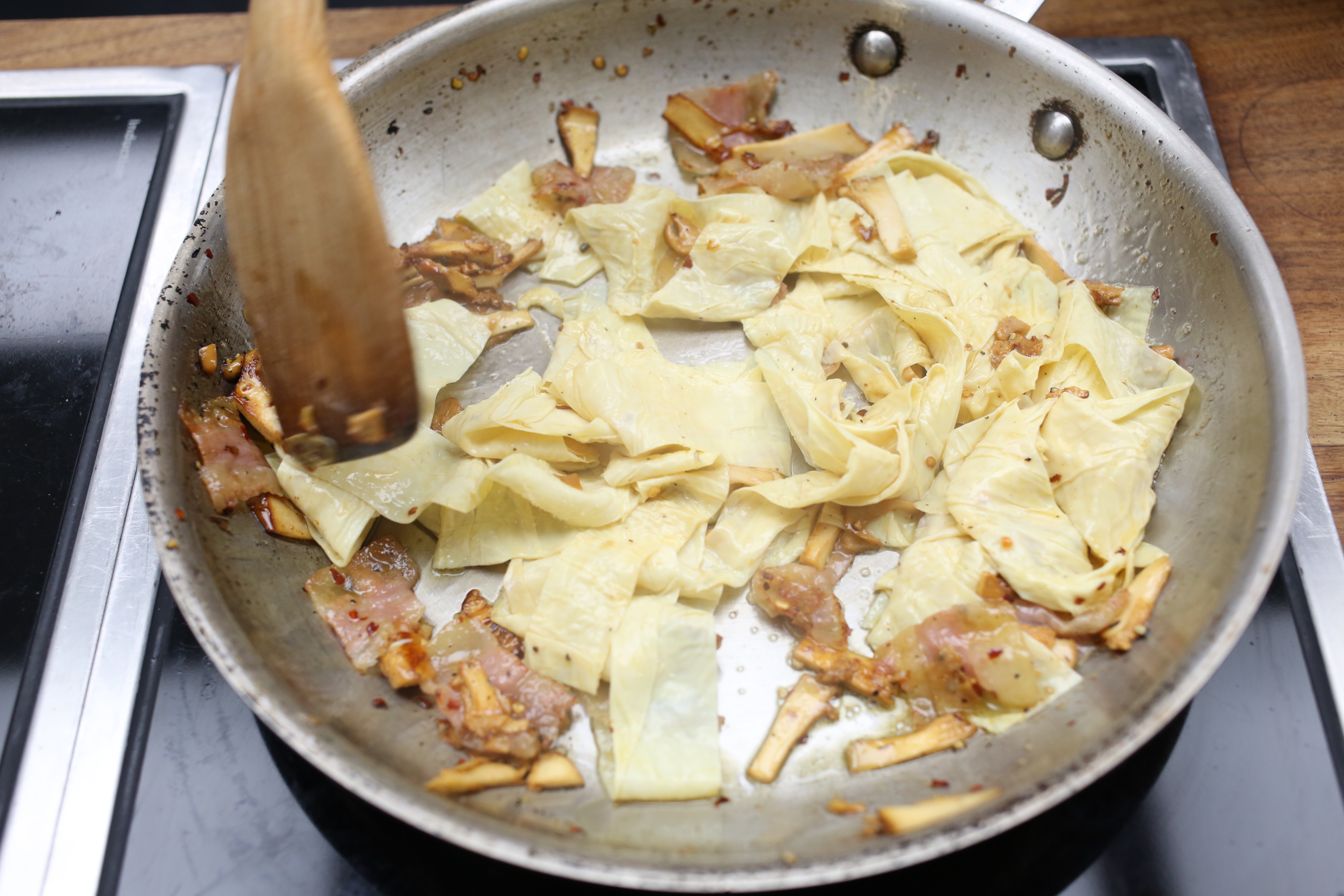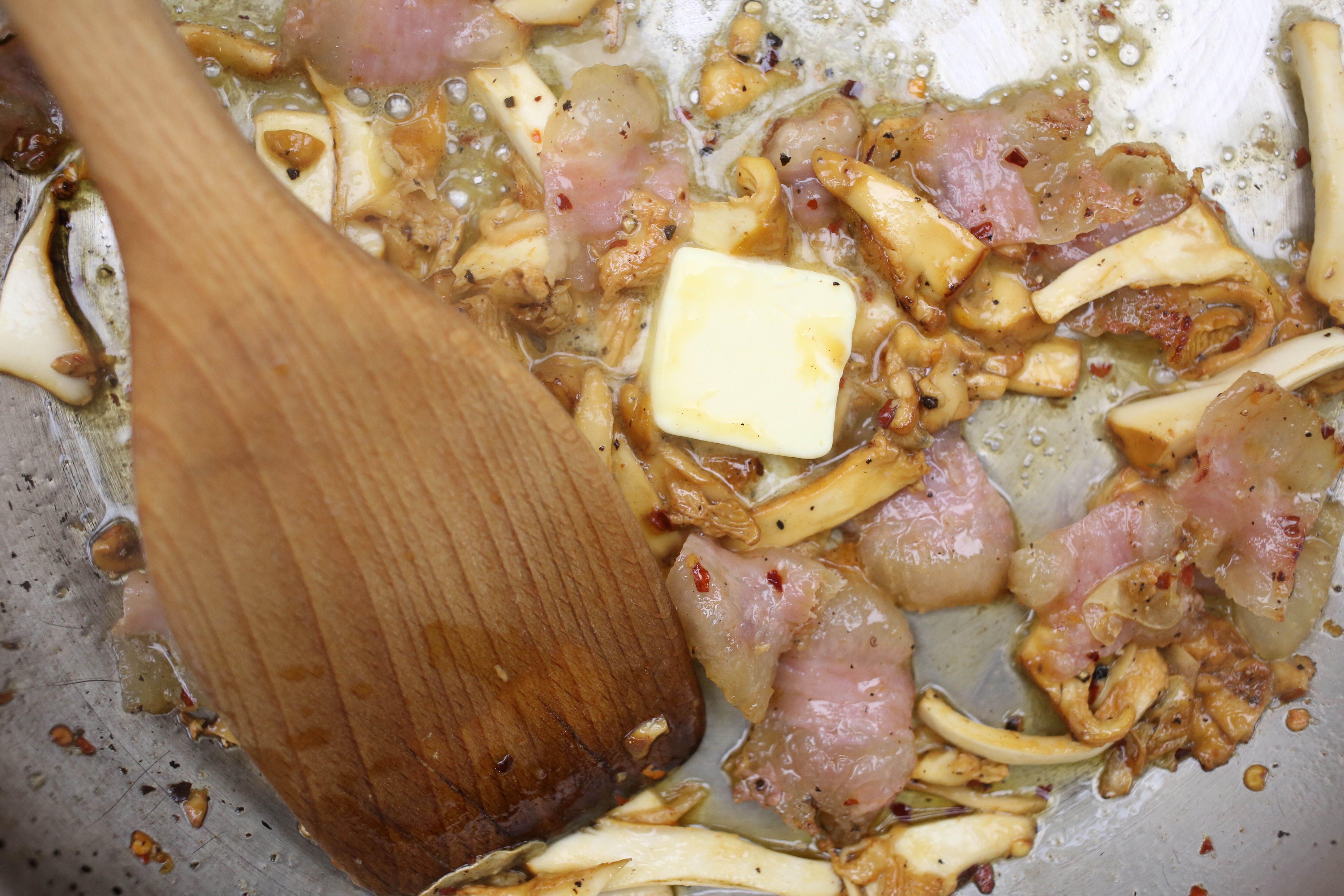 Not willing to incur the wrath of all of Rome, he keeps it traditional with thin-sliced guanciale and red pepper flakes. Once the fat renders out of the pork jowl, the mushrooms get tossed with extra butter and sautéed until golden brown. The yub-oodles get tossed to coat in the porky fat.