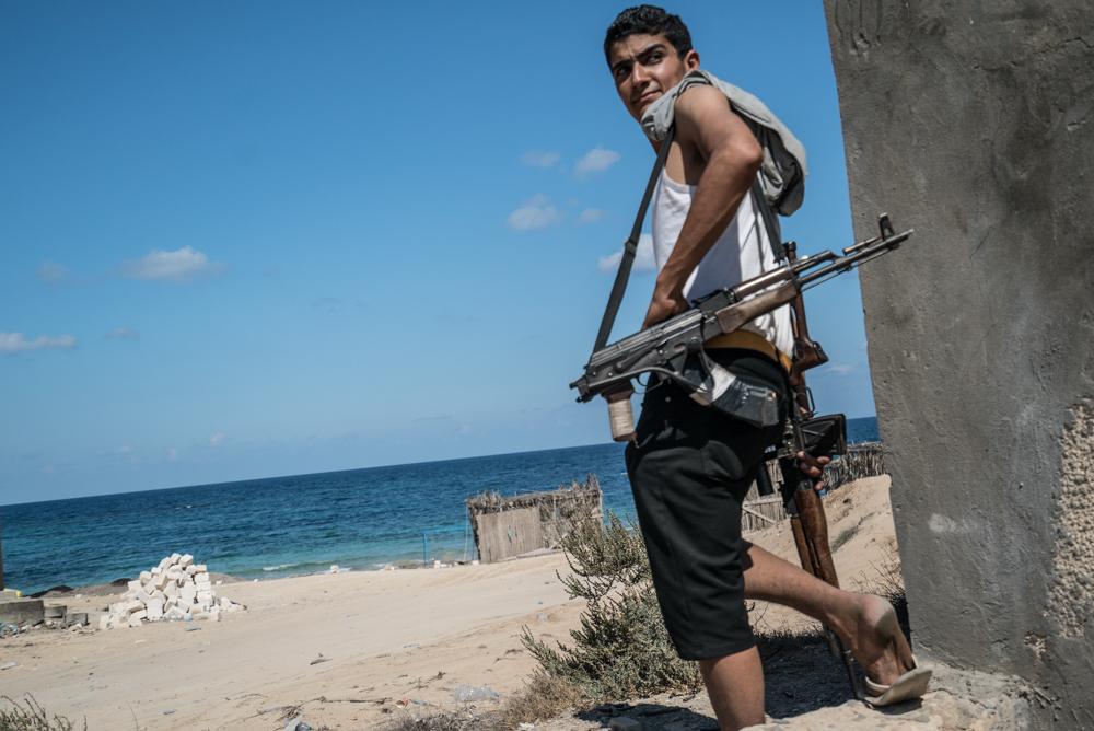It was surreal to be in this beautiful beachside town, with fishing boats bobbing along in the turquoise waters nearby us. It was like a cliche postcard. Except these men were firing at each other from just a few meters apart. (Photo: Spencer Chumbley/VICE News)