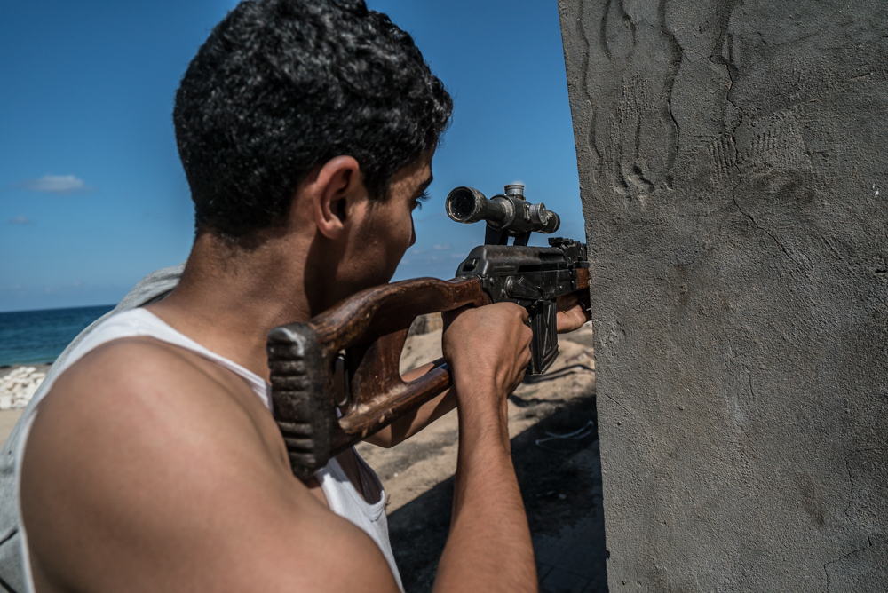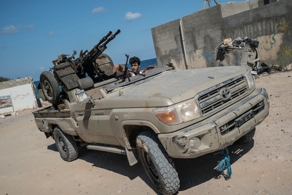 In the smuggling epicenter Sabratha, we accompanied a militia group as they fought for control over smuggling routes. It was a Mad Max style war: large tactical vehicles raced through Roman ruins, topless men with gold teeth and flip-flops fired rocket-propelled grenades from makeshift front lines. (Photo: Spencer Chumbley/VICE News)