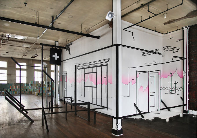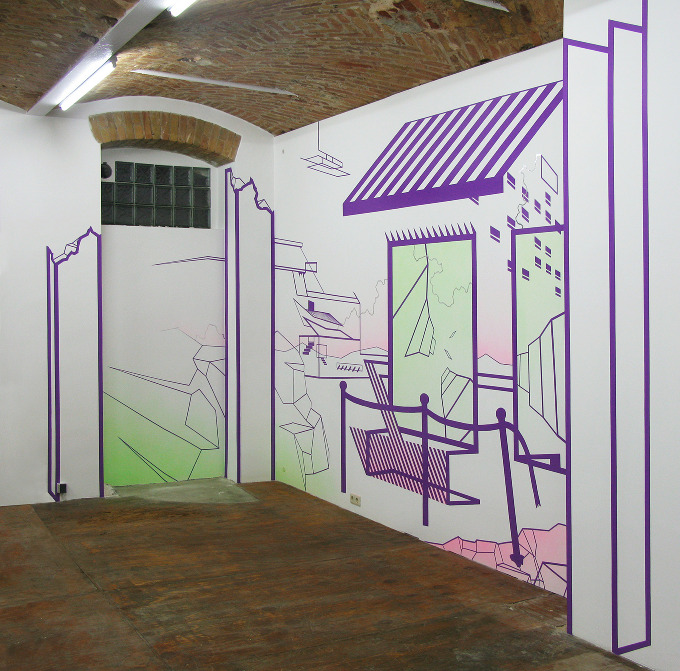 Portland-based artist Damien Gilley makes site-specific installations to create a new, multi-dimensional space of imaginary landscapes through line graphics and optical illusions. Using simple materials such as vinyl tape, wood, aluminum, latex and auto paint, he actualizes his drawings as perspectival installations that break down paradigms of flatness.