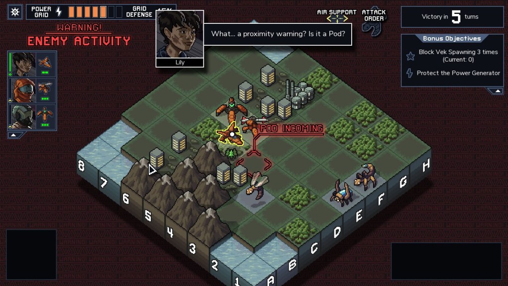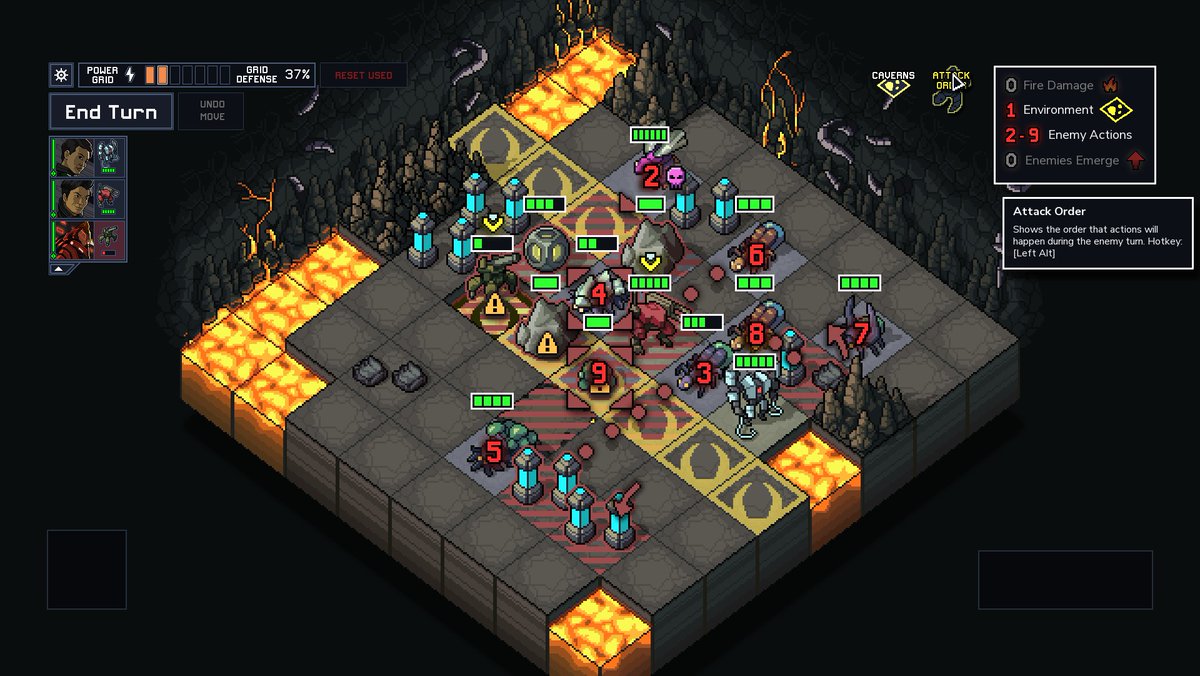 As soon as people started streaming Into the Breach, it became clear that conversations between players and their audiences needed a linguistic glue to hold conversations together. “I”m going to rocket punch that bug” and “What if you electro-whip the purple one” just doesn’t cut it when you’re trying to save the world. One fan built a Twitch overlay that gave the game screen a chess-like grid, and within a day or two, Subset had incorporated the same idea into the game directly as an optional on-screen effect. (Check the header image if you’re curious).
