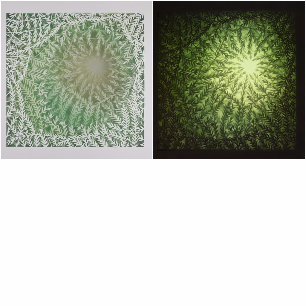 Born in Fabriano, Italy, the 33-year-old artist strives to create a spiritual brightness despite the overwhelming chaos the world may present at times. Mearelli explains how the series, titled Boxes, let’s light illuminate through layers and is made with layered paper, cutting sheets of paper, and oil color on acetate. Each piece fluctuates in its appearance depending on the position of the sun and the subsequent projection of shadows.