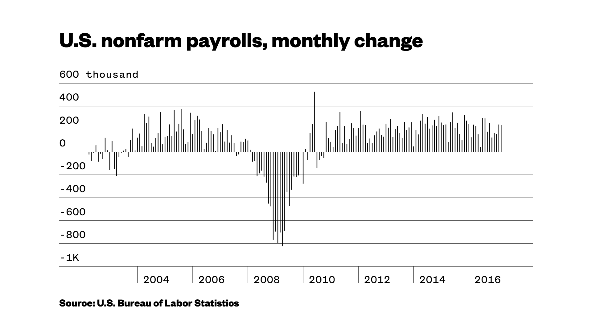 The February report from the U.S. Bureau of Labor Statistics covered the first complete month of Donald Trump’s presidency, making it a political football. He’ll likely tout the positive numbers, but he can’t really take credit. One of the biggest hiring jumps, in construction hiring — the industry added 58,000 — is likely linked to unseasonably warm weather in early February more than to any policy shifts brought on by the reality TV star turned leader of the free world.Nonetheless, a spate of positive economic news could provide a path forward for the Trump administration, whose agenda has been bogged down amid internal power struggles and the unfolding scandal about contacts between Russia and members of Trump’s inner circle.Still, Trump stitched together an Electoral College victory in part by bucking traditional economic thinking and promising to bring back manufacturing jobs to the struggling Rust Belt constituencies that handed him the White House. Manufacturing added 28,000 jobs in February. And average hourly earnings, a measure of wages, is up 2.8 percent over February 2016. (Although in inflation-adjusted terms, wages remain relatively flat.)