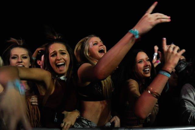 The crowd is also running…somewhere. They go towards the stage, in waves, and just as quickly, they leave. Then they come back, as if having collectively forgotten their sweatshirts. They’re not dancing so much as they can’t sit still, or decide what they want to do. A glimmering, shirtless bro pops up and pogos in front of me during a pitched-out minute or so of “Where Are Ü Now,” then turns around and wanders away to nowhere in particular. At the far edge of the crowd, a couple is making out atop a pile of trash, dry humping in the solitude of nothing and no one around them but crushed water bottles. A glover spends a minute or two frantically working his magic, then stops to check his phone. This happens three times over the course of two songs. Are we having fun yet?