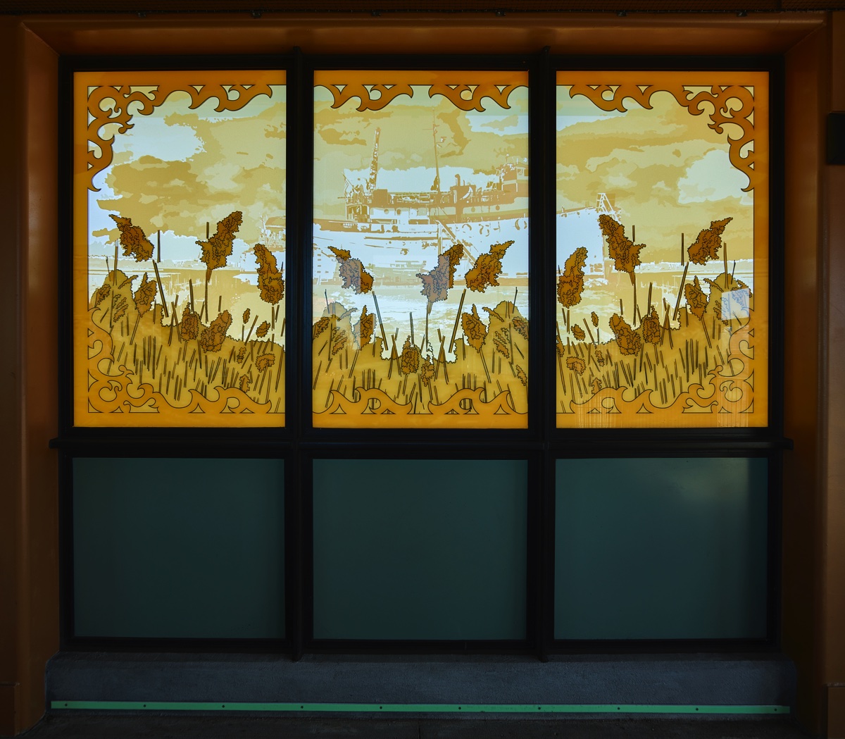 Though enmeshed in the Delaware cultural scene, Lucente finds reasons to return to her childhood stomping grounds. On the Staten Island Railway, commuters using the new Arthur Kill station can find public artwork designed by Lucente. Commissioned by the Metropolitan Transportation Authority (MTA) Art & Design and unveiled in January of this year, Lucente created 28 large-scale laminated glass panels that reflect the area’s diverse past, through illustrations of historic architecture and natural wildlife. For Lucente, an artist continuously referencing place within her work, it was a dream come true.