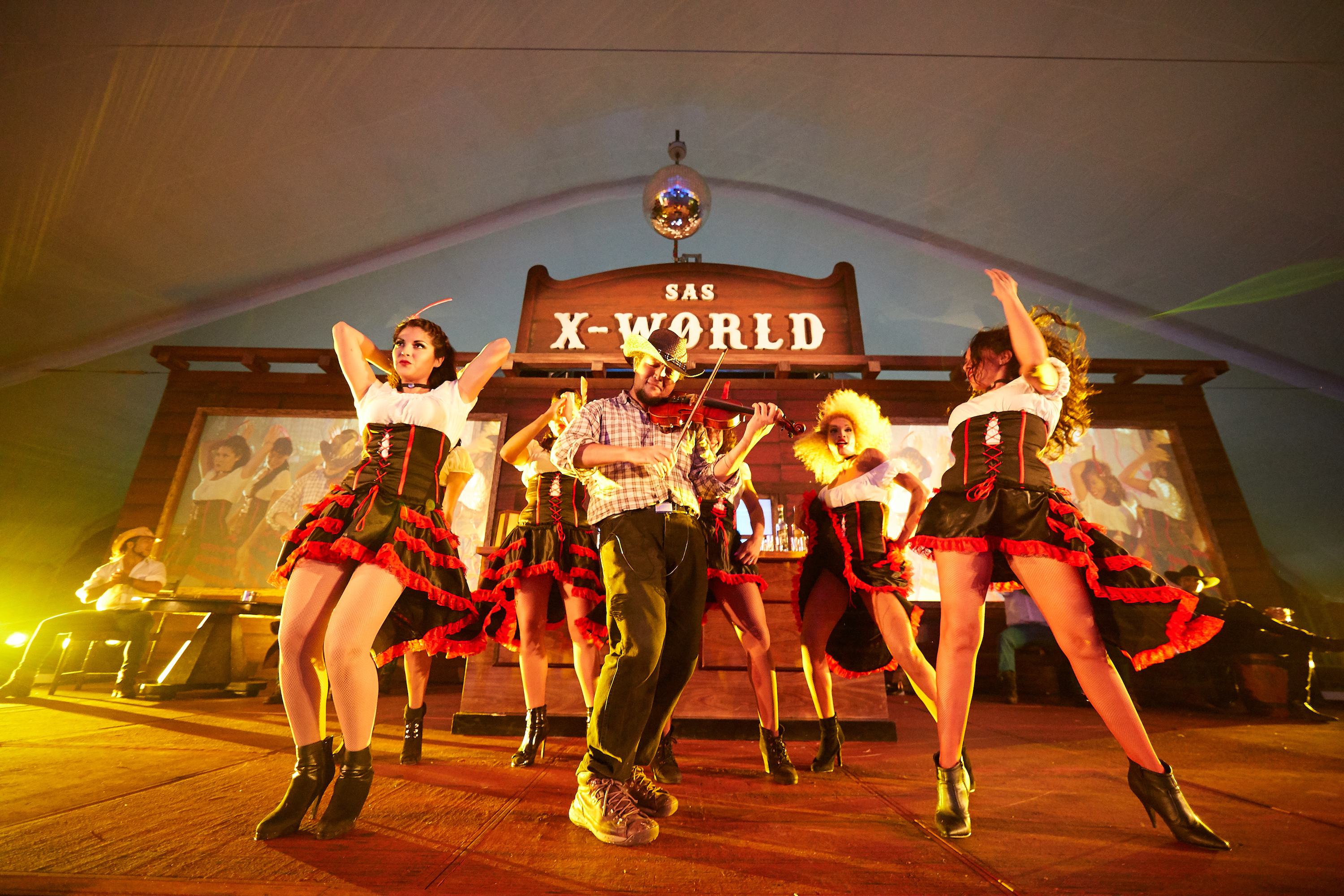 “For the 10th anniversary of SAS, we’ve created something special. It’s a new story, with new rules and new roles,” the woman in the video said. Lights flash around the room, music blasts, and eight actors wearing Old West costumes, in a nod to the TV show Westworld, appear on stage.