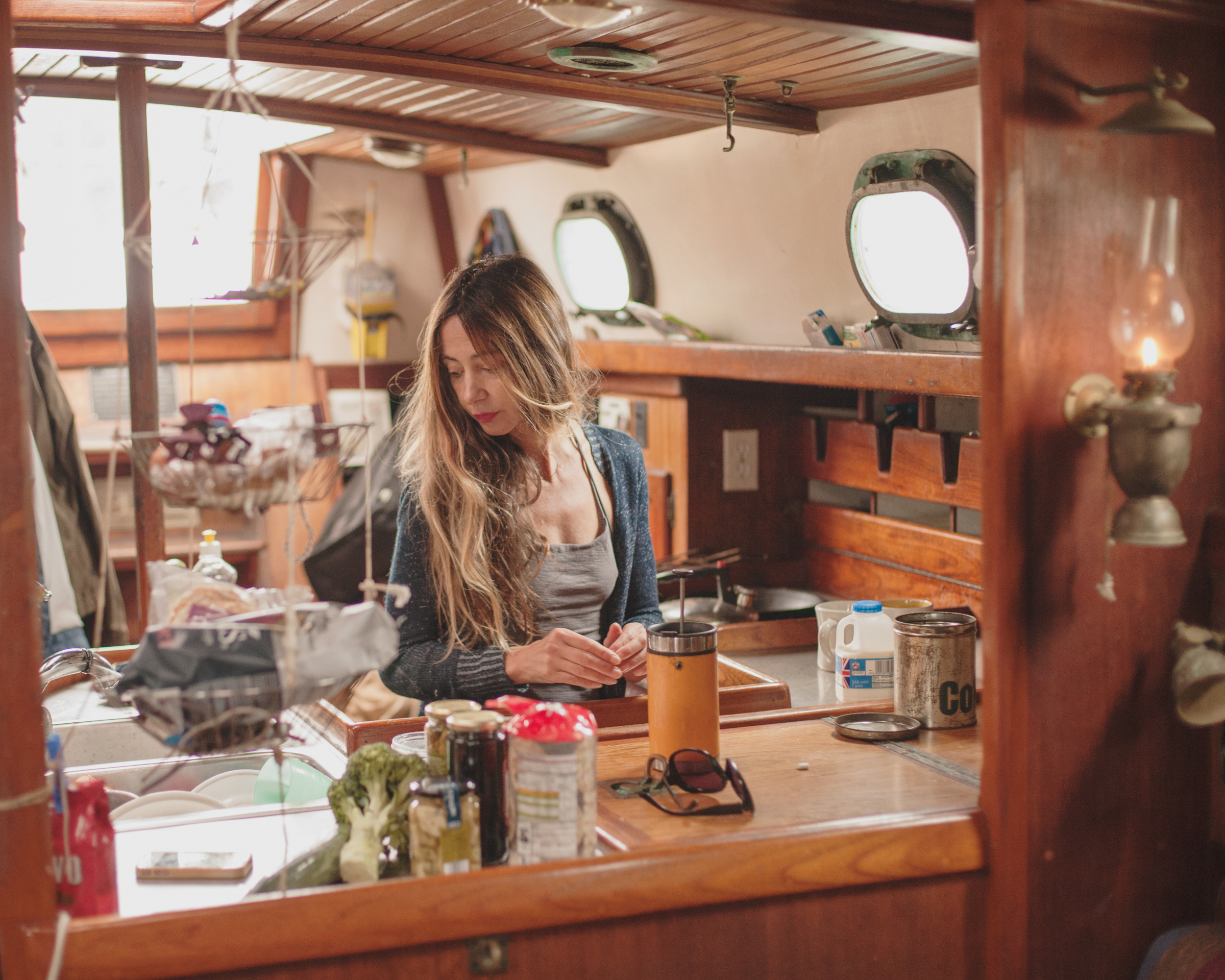 The first thing you notice when you hop down into the cabin are the books – fairy tales; poetry by Dylan Thomas, T.S. Elliot, Sylvia Plath; practical guides to fishing (you have to eat somehow). They’re everywhere. The walls are covered with paintings, most of them done by KatieJane and Leilani. A pair of old, worn heels that KatieJane used to perform in hang from a nail in the wall. While KatieJane makes us a “lunch of champions” (sparkling wine and crisps), Chris gives us a book of family photos taken on the first two years of their travels. A photographer and videographer by trade, Chris has thousands of photos shot on mostly his phone from the whole trip, but this book he made for KatieJane.