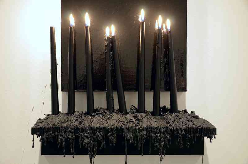 Vincent Como, Paradise Lost 006 (detail), 2011-present, Oil on linen, with wood, wax, and fire, 26.25 x 20 x 5.5 inches.