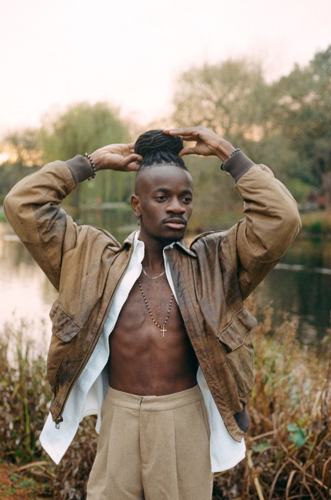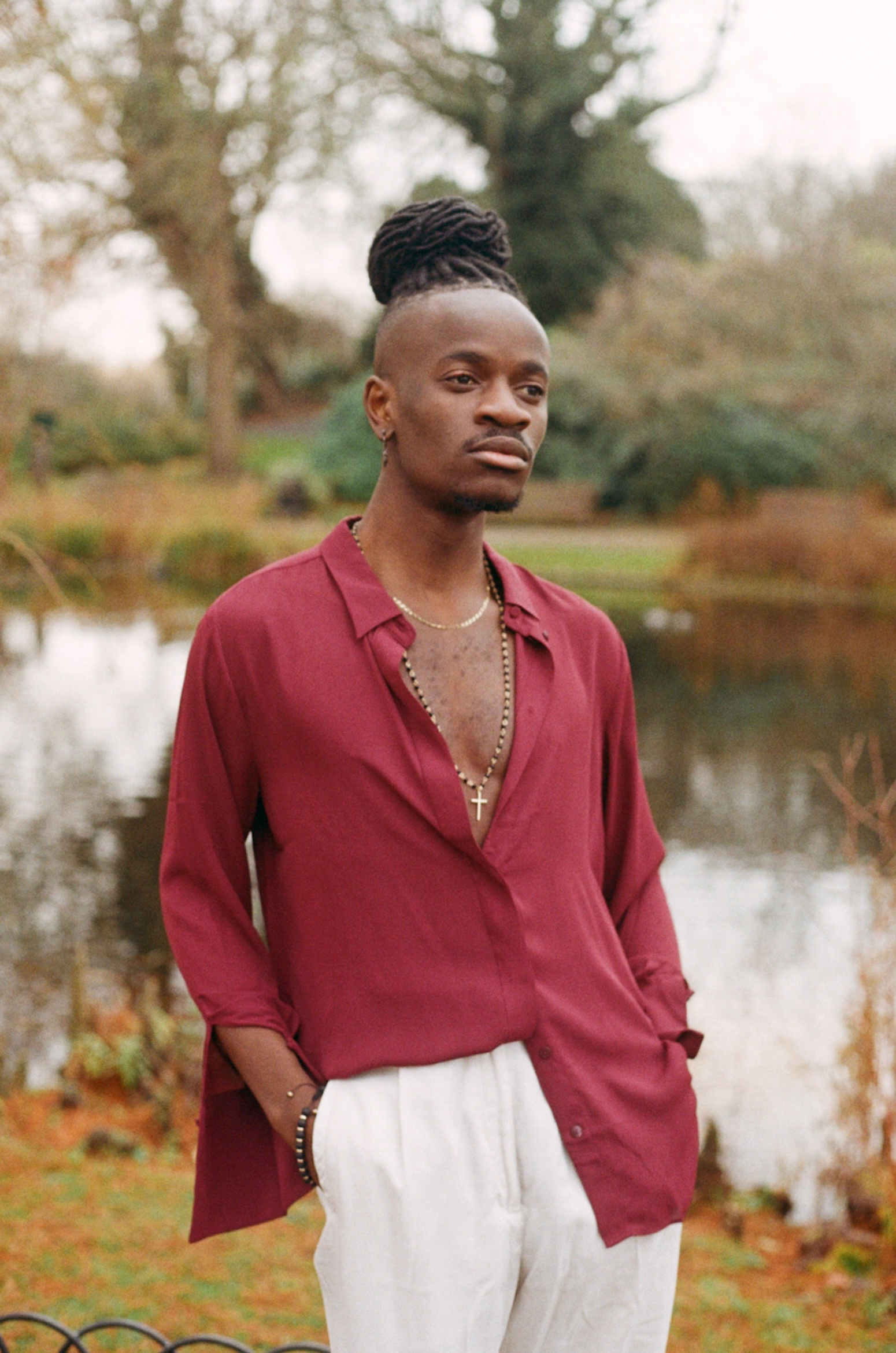 Two weeks later and Kwaye is dragging a giant luggage bag through a gaggle of startled geese beneath the cold white sun. We’ve arranged to meet again in a West London rose garden – although all the flowers have shrivelled among the ice – to take some pics and have a catch up by the lake. When we see each other at the gates he greets me like an old friend and proceeds to show me all the clothes in his carry case: a brown vintage jacket, a full maroon suit, crisp white shirts and various pieces of beaded jewellry. These are outfits he’s brought to change into over the course of the afternoon, and while he’s talking, it strikes me that he possesses the same staunch perfectionist bent present in a lot of our most successful pop stars. When I ask him if he’ll be performing any shows soon, for instance, he dives into a detailed account of all the choreography he has planned for it, partly inspired by Solange’s recent performance of A Seat At the Table at AfroPunk, in which everybody on stage was in synch. “My first live shows will be at the beginning of next year,” he adds, “and you know I’m putting in 100 percent when it comes to the rehearsals for sure”.