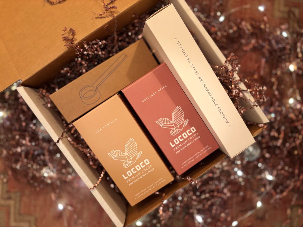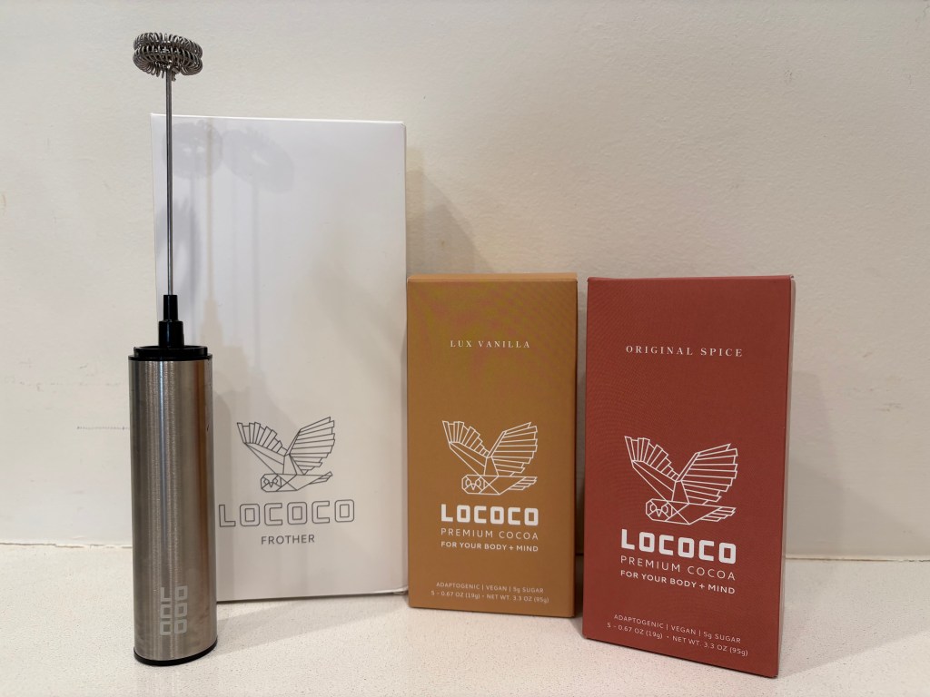 Opening the package was the first treat. The minimalist design and shiny crinkle paper made the whole thing feel like a gift. The kit includes both of Lococo’s cocoas: the spicy, Food & Wine–approved Original Spice and the velvety Lux Vanilla. A rechargeable frother and a wooden scoop are also included so you can whip up café-level foam like someone who has their life together. It comes with 10 single-serve sachets ready for the tasting.