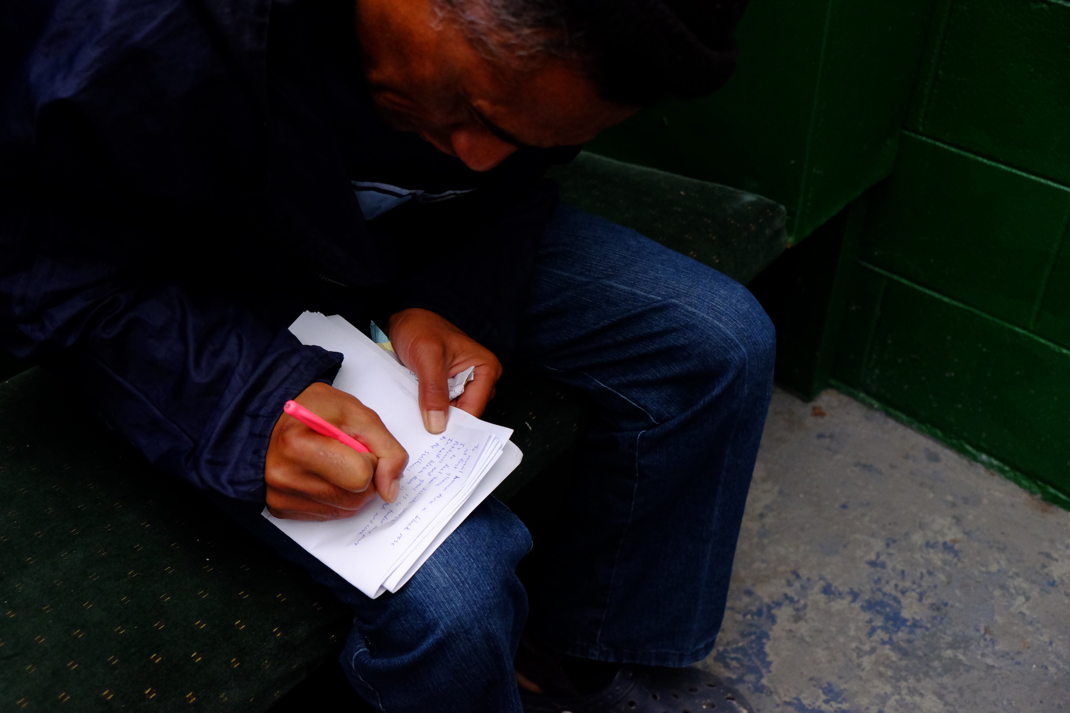 Steve unfurls a small piece of paper, crumpled from the centre pocket of his parka. He smooths it, stands straight-backed and reads: