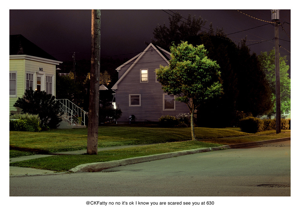 Marni Shindelman and Nate Larson are two artists who collaborate on projects focused on perceptions of time and space in modern life and in relation to social networks. Their most recent series of projects, Geolocation, involves the two choosing tweets which are tagged with location information, photographing the actual spot where the tweets were made, and then pairing the original tweets with their new images. They say the photographs “anchor and memorializes the ephemeral online data in the real world and also probe the expectations of privacy surrounding social networks.” We think the photographs are beautiful, powerful, and slightly creepy, in a really great way. We were so intrigued, we had to have a chat with Nate and Marni about the work.