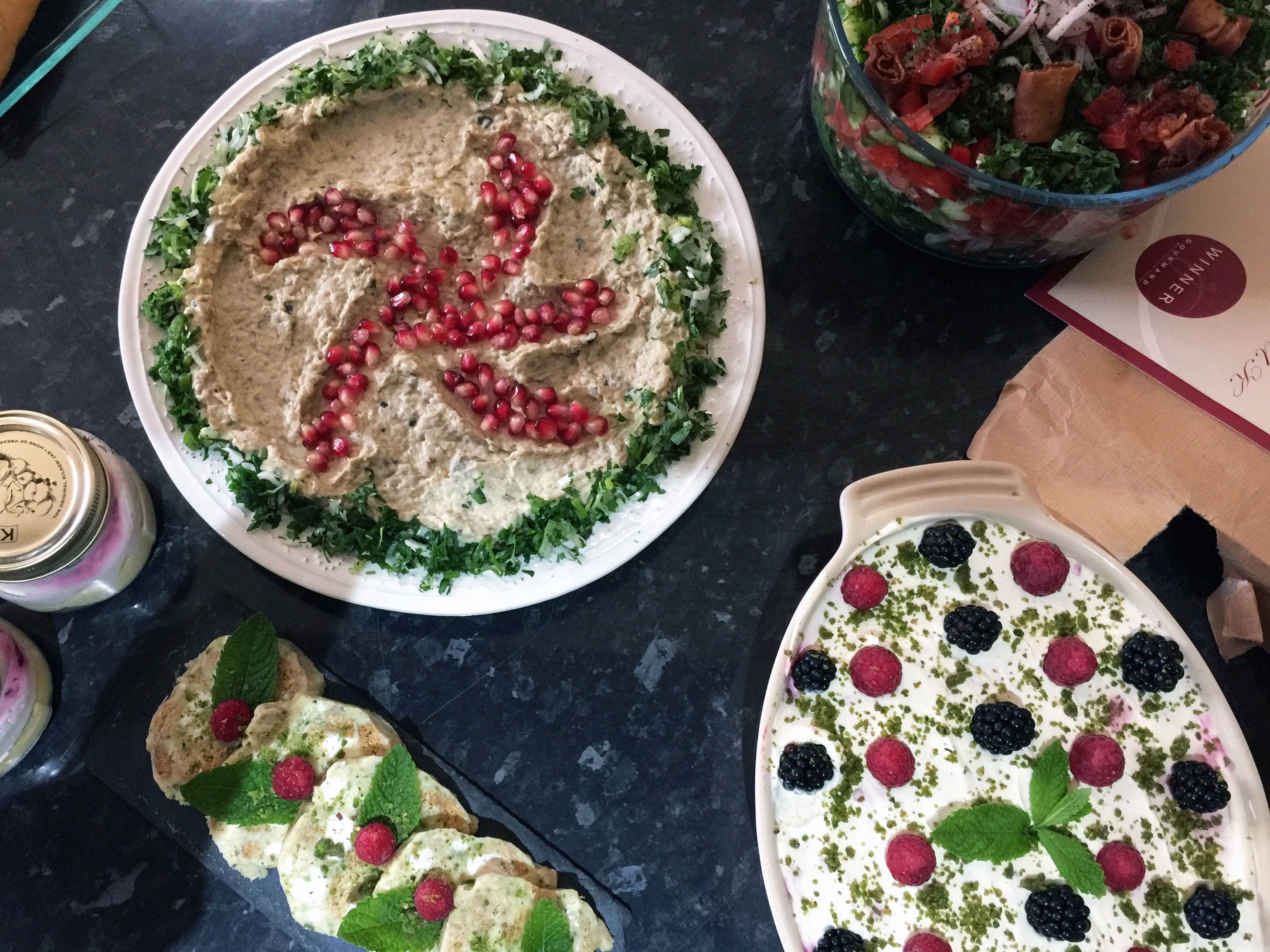 Baba ghanouj garnished with pomegranate seeds, cod with tahini, and a selection of desserts made by Lina Saad. All photos by the author.