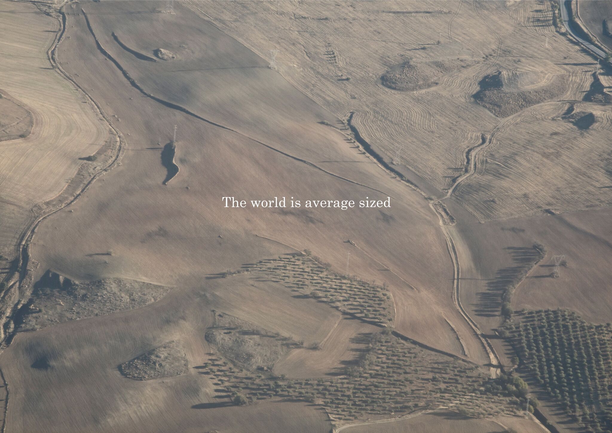 The Europe room’s walls are painted black and the photographs are lit with framing projectors such that they seem to be glowing. A few of them are overlaid with lines from Houellebecq’s writings, translated into English. An American novelist I brought with me to the opening pointed out that the line printed over an aerial photo of a barren desert-like landscape (probably Spain again) that reads “The world is average sized” at VENUS goes “The world is medium-sized” in Lorin Stein’s translation of Submission. The latter version, with its commercial valence, says it better. Houellebecq told me that a series of aerial photographs of apartment blocks from the Avallon suburbs was shot from a hot air balloon, which he enjoyed riding in because it was possible to stop in the air and maintain a constant altitude. A poet I saw at a party the next night remarked that a hot air balloon was a good metaphor for being a novelist.