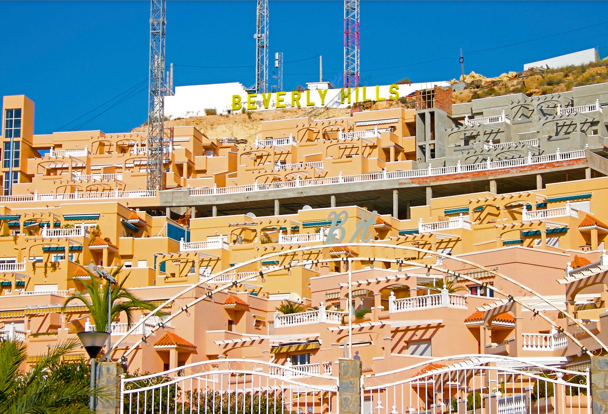 Something like this attitude pervades the images in “French Bashing.” The show draws on a larger set of works Houellebecq exhibited in 2016 at the Palais de Tokyo in Paris, Rester Vivant (To Stay Alive), drawn from photographs he’d been taking for more than two decades. The show at VENUS is split into two rooms, one themed around tourism, the other Europe. The tourism room is brightly lit with white walls and the images range from sleek modern wood-paneled hotel lobbies and elevator banks to garish reproductions of resort signage and advertisements. I asked Houellebecq if a kitschy cow standing atop an advertisement for farm produce in front of a grassy seaside landscape at dusk was a sign of Americanization. “In France we like our cows too,” he said. The floor of the room is covered in tacky placemats lifted from tourist holes all over the place. An image of hotel balconies under a “Beverly Hills” marquee struck me as nothing like anything I’ve seen in Beverly Hills. Houellebecq explained that it came from a town near his holiday home in Spain.