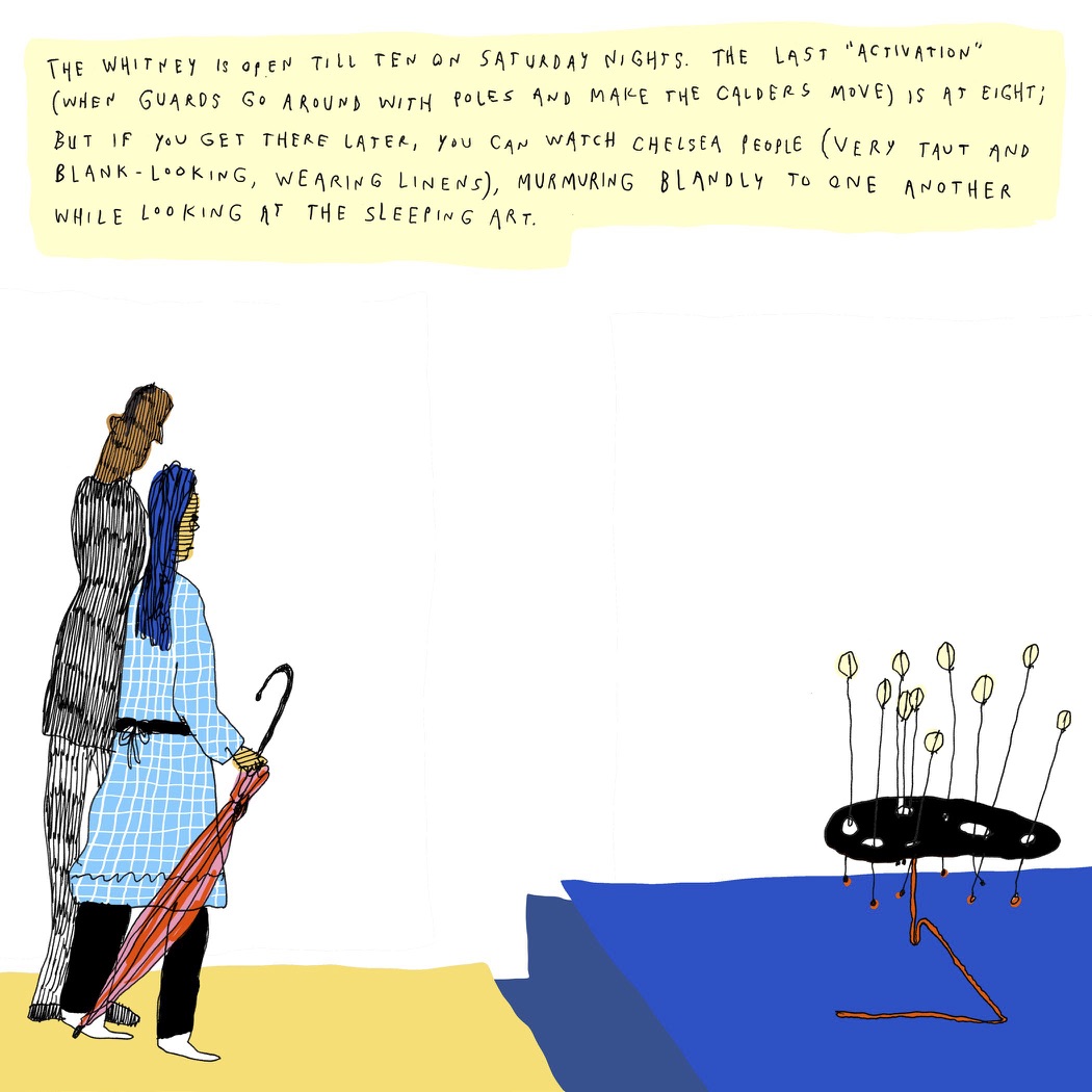 Some of New York’s best art experiences are to be had away from the social whirl of exhibition openings; late summer hours at the city’s museums offer up a scene all their own. Cartoonist Liana Finck toured the Whitney’s current show of Alexander Calder’s classic mobiles on a recent Saturday night, recording some unexpectedly static art animated by a typically stylish crowd.