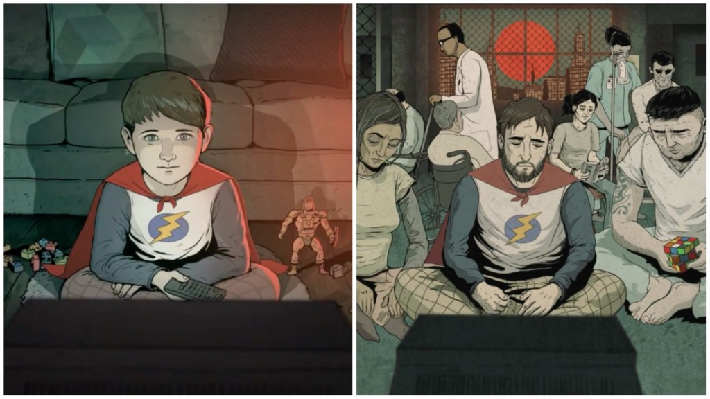 90s kids will never forget the TV characters Moby and Steve Cutts brutalize with the worst of capitalism in their new video for “In This Cold Place,” off of Moby & The Void Pacific Choir’s latest album, More Fast Songs About the Apocalypse. The ruthlessly satirical video shows that Care Bears, Tom & Jerry, Transformers, Superman, Pinnochio, Super Mario, and the Masters of the Universe are all helpless against xenophobia, factory farms, poverty, war, consumerism, corruption, and war. An unnamed protagonist transforms from a chipper boy sitting wide-eyed in front of a TV screen to a weathered, aging man watching the world turn into a living hell around him.