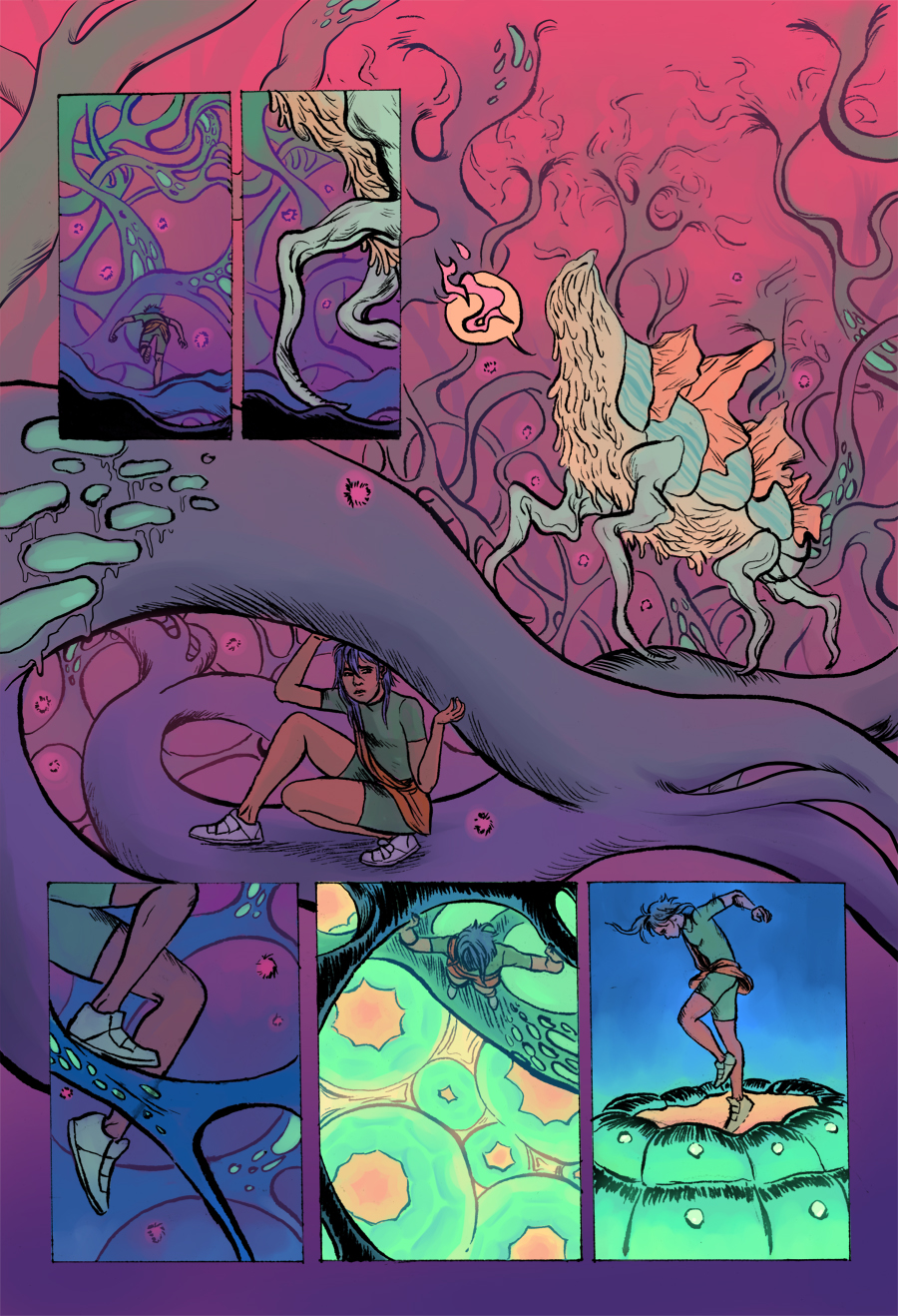 I originally asked Riley for something about a minute long, little atmospheric vignettes that would be sonic snapshots of the world. Riley went above and beyond, providing these beautiful lengthy pieces that really move with the comic and still have space to breathe. I imagined that after the first reading (a link to the music is on the last page), the reader could go through the pages again to the beat of the music, letting it move them along at its own pace. I think it adds a heavy layer of emotion, anticipation, and tangibility with Vep’s world.