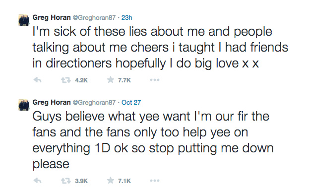Greg has tweeted several things since he complained about Niall’s absence. The first: that he was hacked and has nothing but a good word to say about Niall. Classic story. The second and third: an unintentional admission that he’s taking Directioners for a ride.