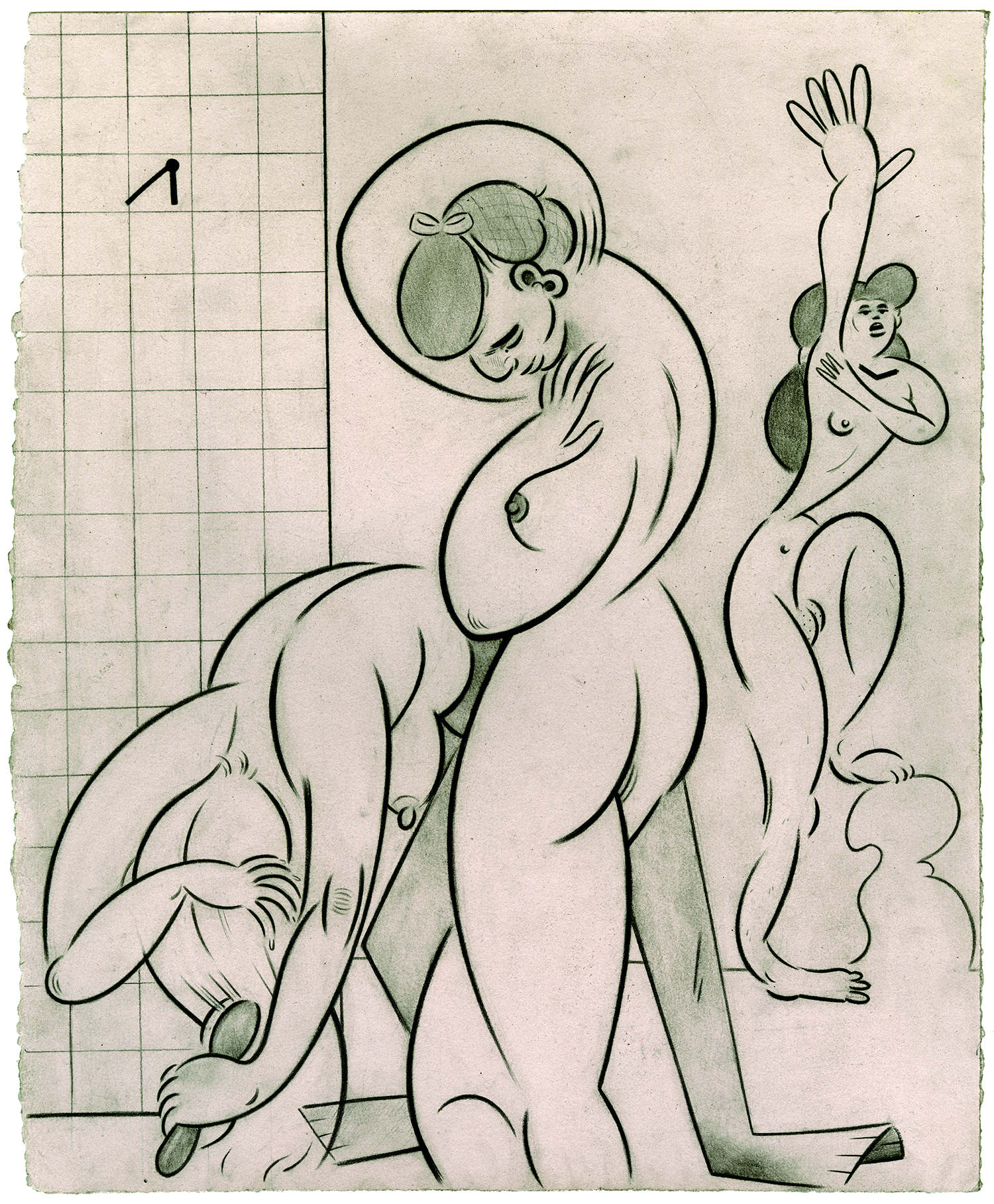 Three Bathers, 2017. 14″ x 11″ Graphite and casein on rag paper.