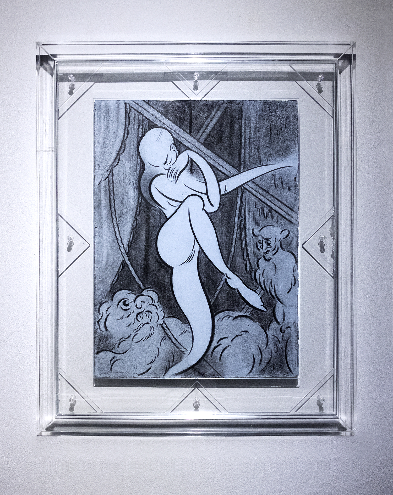 Elena, 2017. 21″ x 17″ Graphite, charcoal, chalk, and casein on rag paper in artists made acrylic frame (for upcoming show The Set)