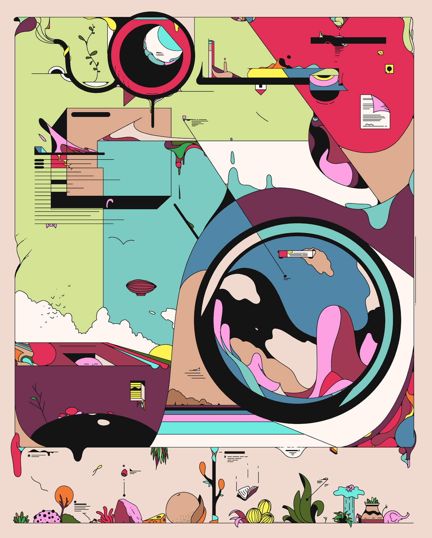 With their geometric and highly surreal abstractions captured in lush, bold color palettes, the slick new illustrations by Israeli artist Ori Toor mark a steep departure from the fuzzy nightmarish GIF animations he has become known for. His new series of works signifies the artist’s attempt to focus more on creating holistic compositions rather than single elements in space. The artist says he is trying play around with the format of a poster rather than the dimensions of an Instagram image, and return to an art form that is more line-based, as opposed to what he calls “blob based.”