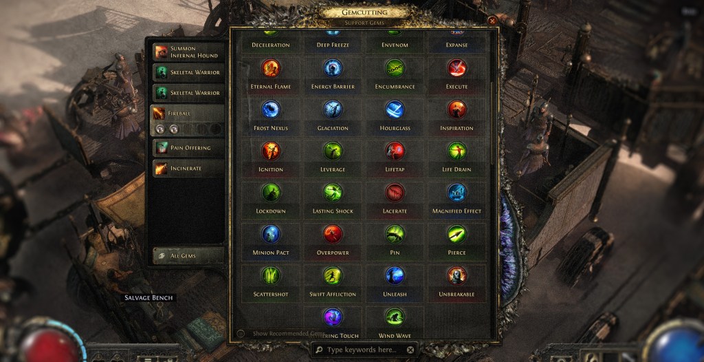Each Skill Gem has a surprising number of supplemental Support Gems that can be used. While the game tries to recommend what it thinks you’d like, having the full list of options opens up a world of build diversity and experimental play. This, in essence, is what Path of Exile is all about. Want your Earthquakes to deal added fire damage? Slap that sucker on. Want your lightning spells to cost life instead of mana? You can do that.