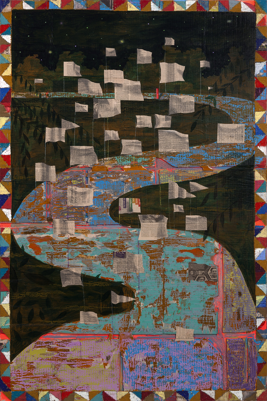 While his paintings deal primarily with groups, Fordjour’s newspaper collages, which he calls “Works on Paper,” are individual portraits. Still often costumed like athletes and cheerleaders, the characters in these more intimate works offer deeper and more personal stories. In the background, leaves and newspapers frame the face, setting up an internal world for the character. They frequently look away from the viewer, often with their eyes closed, denying the viewer full access.