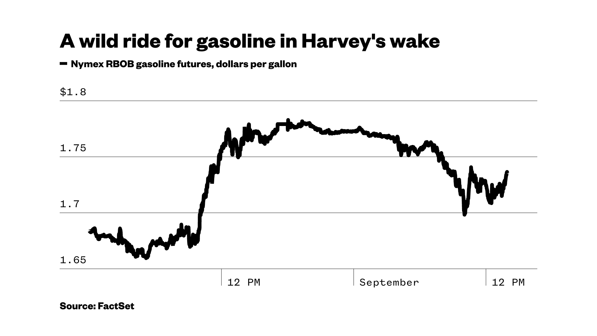 The good news is that there appears to be no major permanent damage to the energy infrastructure of Texas and Louisiana. But it could nevertheless take some time to get the region’s shuttered facilities, which constitute more than 20 percent of U.S. refining capacity, back running at full speed.In a statement about Harvey’s effect at the pump, AAA spokeswoman Jeanette Casselano said prices should drop quickly “by mid to late September” as facilities come back online.Other details to watch:– Wholesale gasoline prices, a handy measure of how much pain refiners and their customers are feeling, eased somewhat on Friday, off about 3 percent. But they still posted a hefty 12 percent gain for the week and hit fresh 2-year highs, driven by Harvey.– Energy markets drew some relief on Friday from the Energy Department’s decision to release 1 million barrels of oil from the Strategic Petroleum Reserve as a response to Harvey. The SPR is a government stockpile of crude set aside for emergencies. The SPR oil is headed to Phillips 66’s refinery in Lake Charles, Louisiana, which was unharmed by Harvey, Reuters reported.– U.S. fuel demand averages about 20 million barrels a day, according to the Energy Information Administration. And Labor Day weekend, which kicks off Friday, traditionally sees the year’s highest gasoline demand as drivers take off on trips to see family, visit friends, or hit the beach.