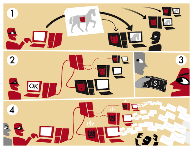 How a botnet turns computers around the world into spam-sending zombies (Wikipedia)Not to mention, notes Kanich, that if you're buying something with a credit card, you have all the control. If the pills don't show up, or if they turn out to be Tic-Tacs, you just get your credit card company to reverse the charge. At that point, spam is no worse than the Rite-Aid coupons I have to recycle once a week.But Vincent Hanna, a researcher with Spamhaus isn't worried about differentiating the bad from the not-that-great. "Obviously some are more dangerous than others, but in the end, it's all email that you didn't ask for," he says. "Our main reason for existence is trying to make sure that you get as little spam as possible. And if that's an email selling Viagra or a fake university diploma or something with a malicious attachment. If you want a clean inbox then you don't really care what it is. You just want it to be clean."We've posted about botnets before (here, and here) but this seems like a good time to bring up a crucial point — botnets, and really, most of the innovation in the malware industry — if I can call it that — can be linked to spam.