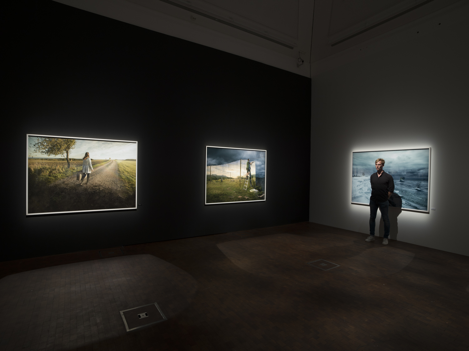 Shards of mirror-smooth water shatter against a lake bed. A mountaintop post office is visited by a mail delivery hot air balloon docked on a cloudy platform. Workers wearing white uniforms and hardhats install a floating, luminescent moon in an otherwise dark sky. Swedish photographer Erik Johansson has a knack for seeing fantasy wonderlands where others see mundane objects and a commitment to realizing them without computer graphics. Now, he has his largest show ever, featuring three new photos and his first indoor installation, an Escher-esque staircase proclaiming the name of the show, Bending Reality.