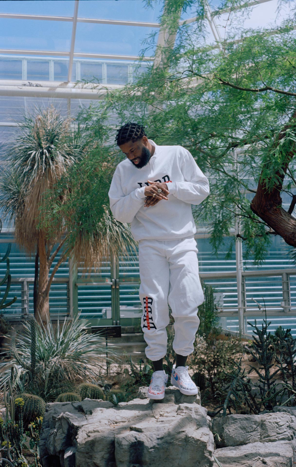 With this new collection of photos, the duo wanted to capture the intimate and vulnerable side of hip-hop that is often ignored. “Since Twelvyy is blooming into his rap career, I thought the Botanical Garden would be a wonderful place to depict this new state of consciousness,” says Aversano. “We photographed near a lot of cacti because the species is charged with spiritual and healing energies that I believe we all need to share and experience.”