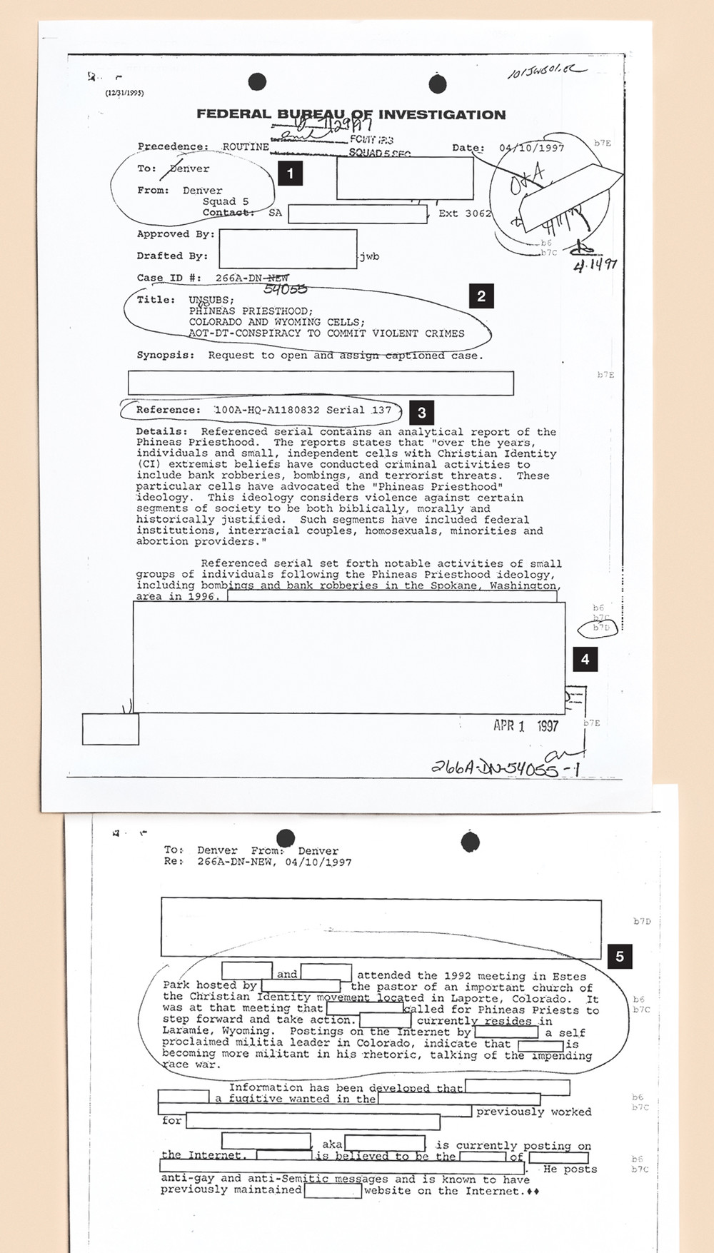 Following the shooting, we filed a Freedom of Information Act request with the FBI for everything the bureau had on the Phineas Priesthood. About one year after our inquiry, the FBI sent us fewer than a dozen pages of documents dating back to April 1997. The files make it clear that the Phineas Priesthood has been on the FBI’s radar for two decades. The FBI wrote in its accompanying production letter that it likely has additional records, but the released cache sheds light on how the bureau views the group and others like it.