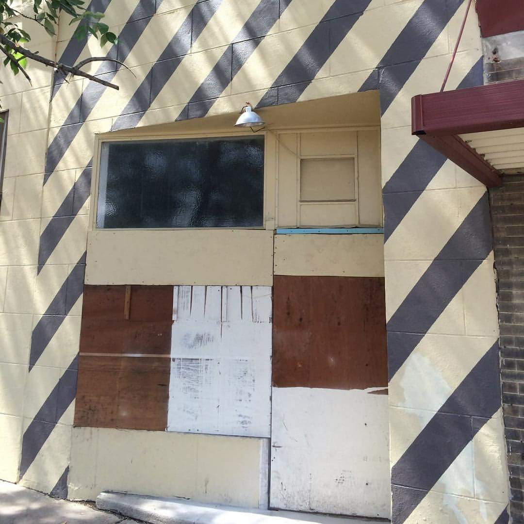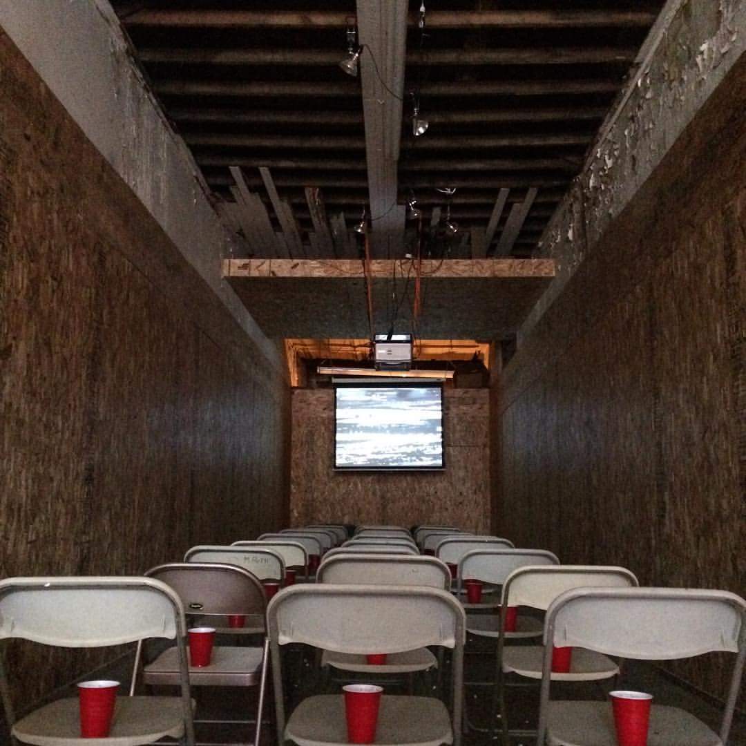 When they first moved into the storefront on the corner of Vinton and Elm Streets, the walls were made of super-distressed plaster on top of brick, the front windows had been busted out, and the front door was gone. For the first few shows, Damon and Powell had to go outside and unscrew a piece of plywood that covered the doorway so guests could get into the building. With each new show, the walls became more and more eroded, so they eventually decided to clad the space in an equally goofy and affordable coating using four foot by eight foot pieces of plywood.