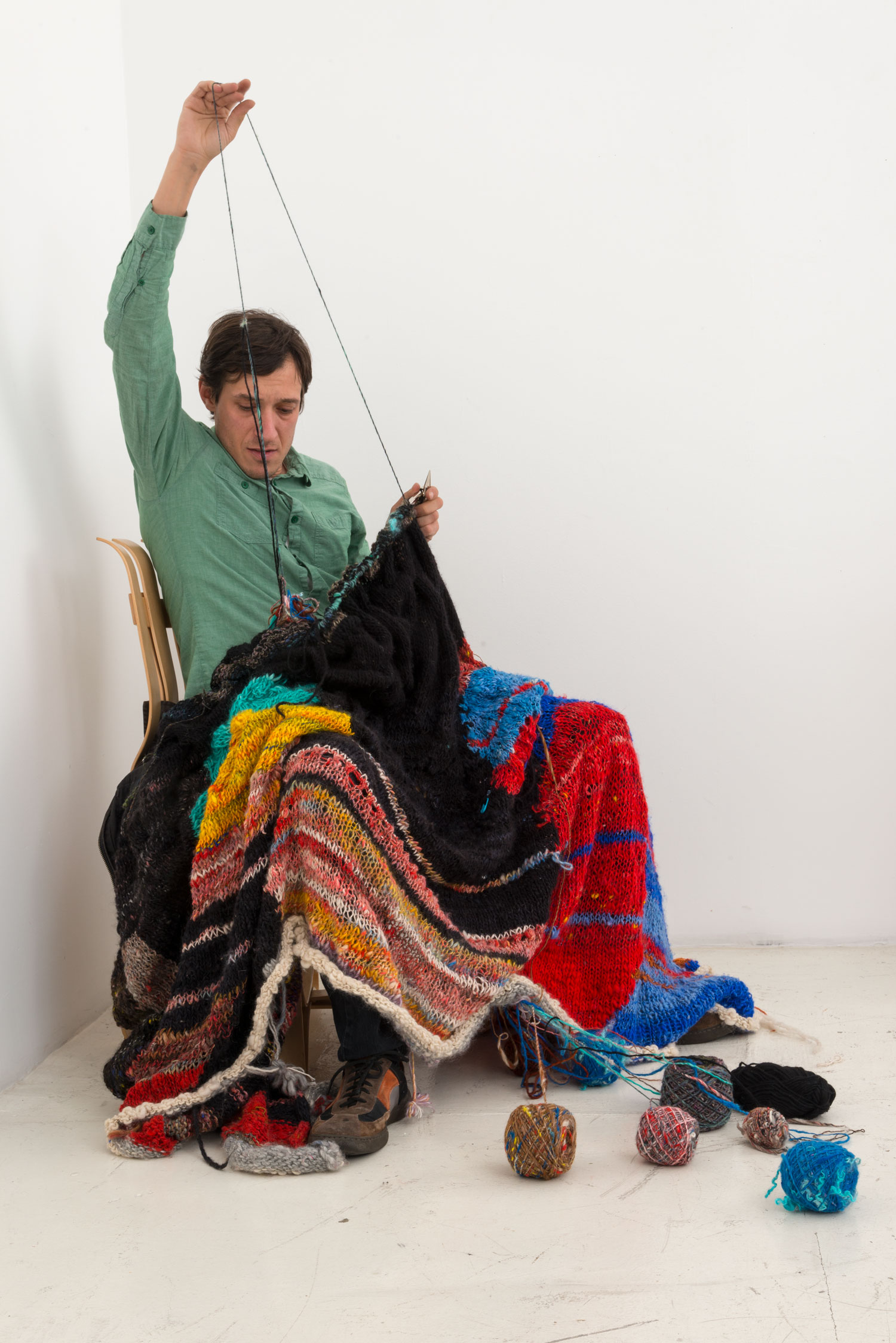 The artist explains that he first got into knitting after wanting to keep his restless hands busy when away from his studio. He’d been working with performance art and sculpture, then began to use knitting itself an art form, understanding how it was connected to drawing, painting, and kinetic sculpture.