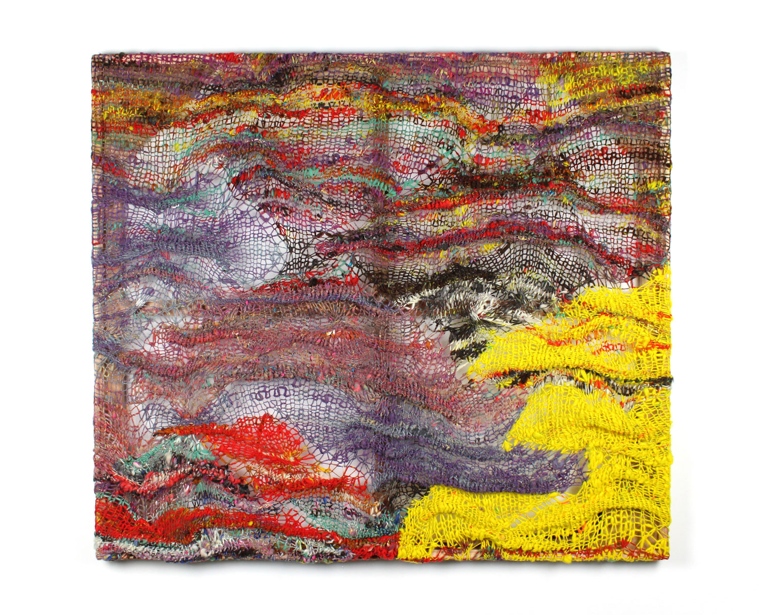 “In my stretched knitted works, I leave the frame at least partly visible through the knits, suggesting a physical continuum in which a work of art exists in two, three, and even four dimensions,” notes Hansen. “Each dimension existing as the shadow of the next. In this way, what might look like a painting is actually a portal—flexible, functional, provisional—with the knitted fields being far less measurable to the observer than the more obviously defined frame that they are stretched around. What is framed is essentially a question.”