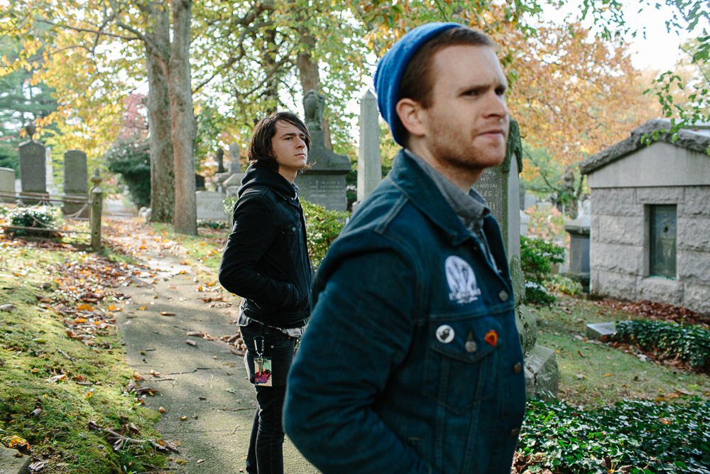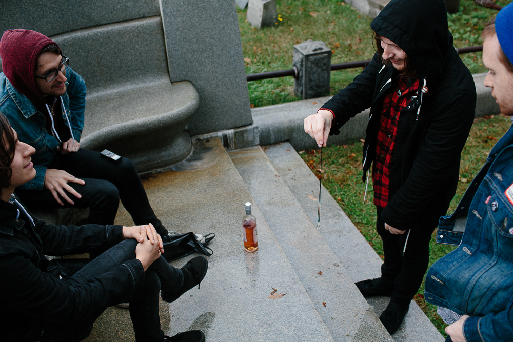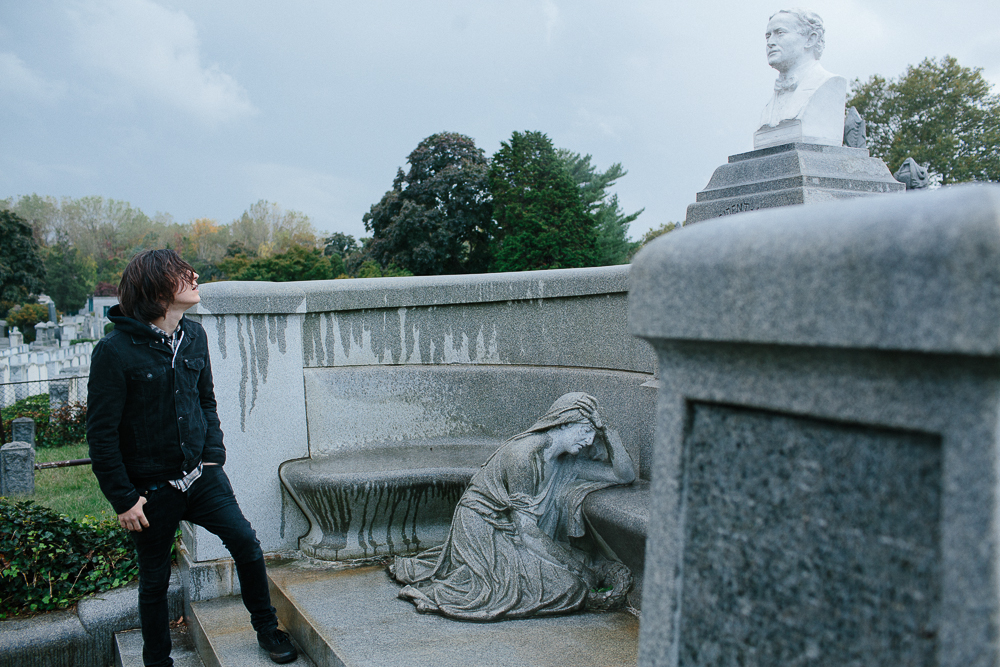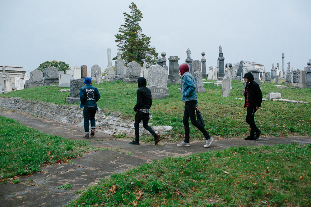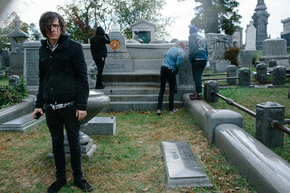 Photos by Carly HoskinsIn a run-down part of Queens, New York, I’m with the members of Dads—drummer/vocalist John Bradley, guitarist/vocalist Scott Scharinger, and recently added bassist Ryan Azada, plus tour manager/merch maverick and band photographer Carly Hoskins—searching for the grave of Erik (later Ehrich) Weiss. As soon as we’ve parked the van, it starts raining; grey clouds and grey graves litter the landscape of the now-abandoned and somewhat neglected Machpelah Cemetery. No one really knows where to go, what to look for, or what to expect when we find it, trudging along paths that wind through a plethora of plots and wondering just how many people are buried here, how they died, who they were, and where they are now. It’s Azada who spots it first—a hulking mass of granite that, until its restoration in 1996, was the victim of both neglect and vandalism and laid in a terrible state of disrepair.For an abandoned cemetery it’s not spooky—OK, not that spooky, especially when it’s lunchtime on a sunny October day and you’ve brought along a couple of bottles of wine—but there is a certain aura and atmosphere that stops you in your tracks when you reach Weiss’ tomb. It’s a mixture of reverence, awe, and creepiness, especially when you see the woman, cast in stone, who’s kneeling and weeping at the exedra that spreads out beneath the bust of Weiss. Both in life and death, Weiss was better known as Harry Houdini, a name he adopted at the age of 17 and which he legally changed in 1913, at the age of 29.